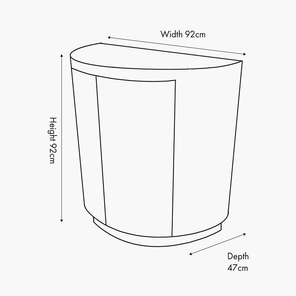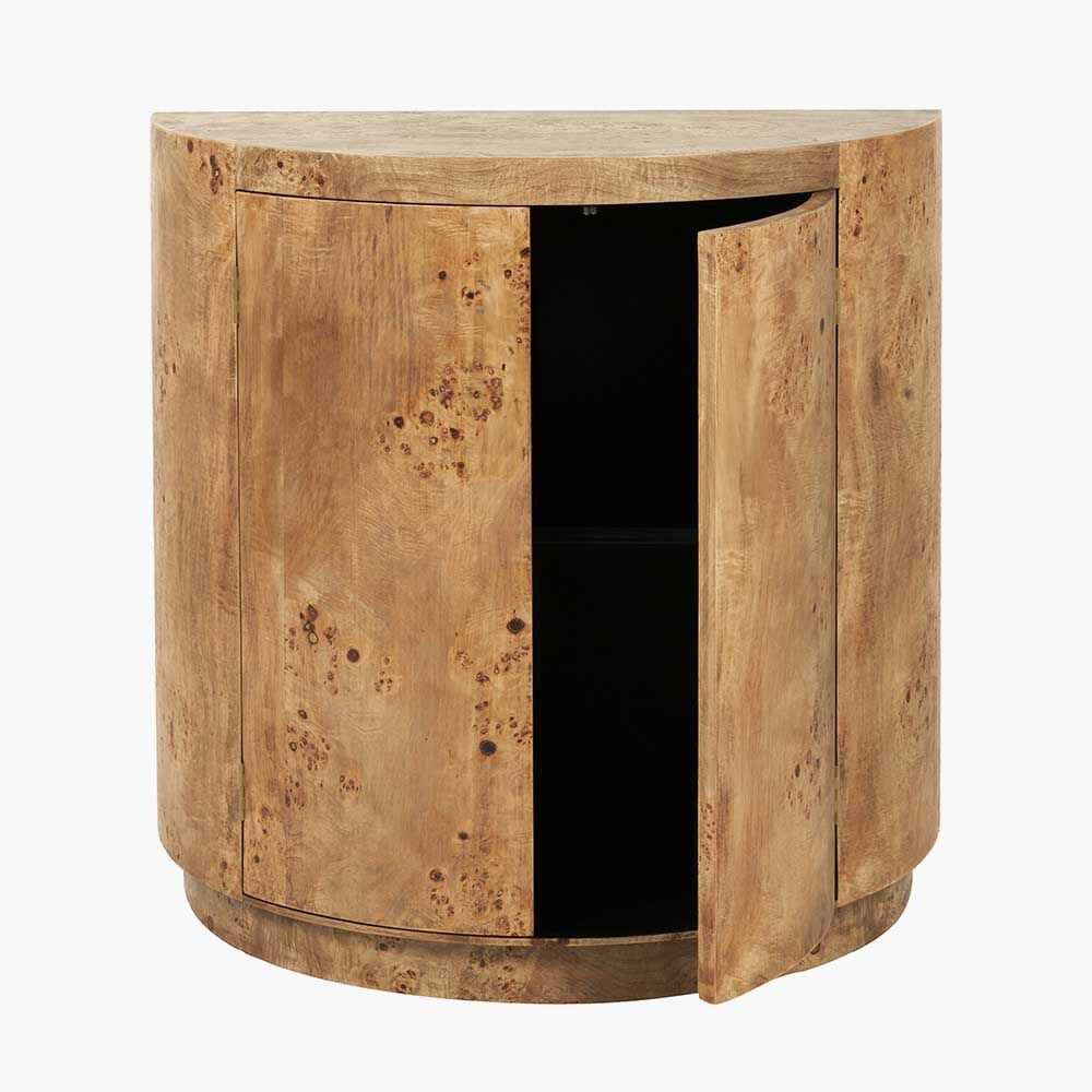 Indulge in luxury with the Newborough 2-Door Cabinet. This half-moon-shaped cabinet features a stunning burr wood effect, showcasing timeless elegance. The burr wood effect surface showcases the distinctive, swirling patterns of wood taken from knotted growths on trees, capturing an organic, natural beauty. The smooth, curved doors open to reveal ample storage, including an internal shelf, allowing you to keep household items neatly organised while making a bold statement in any room.