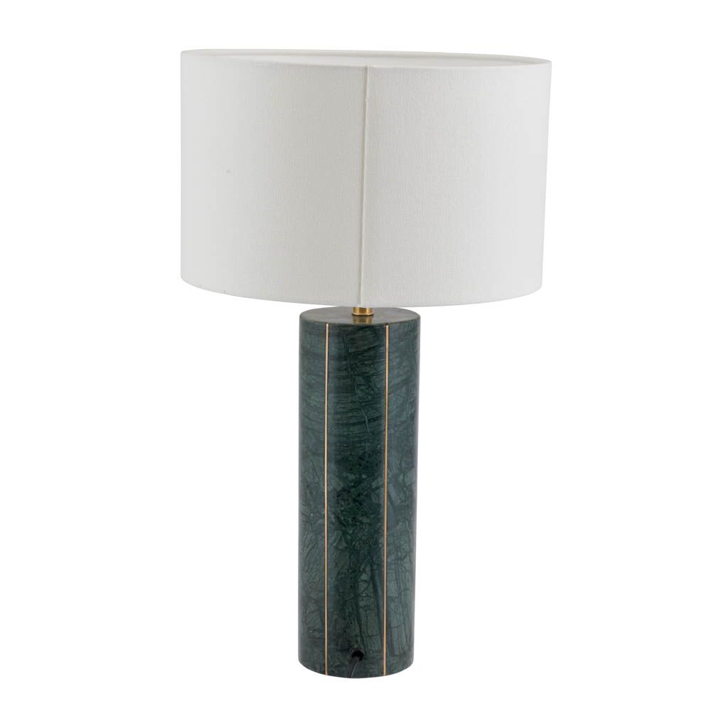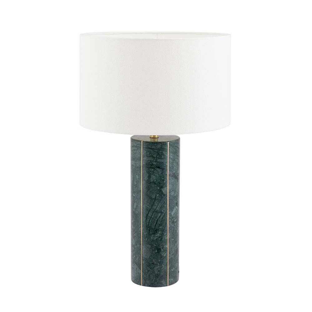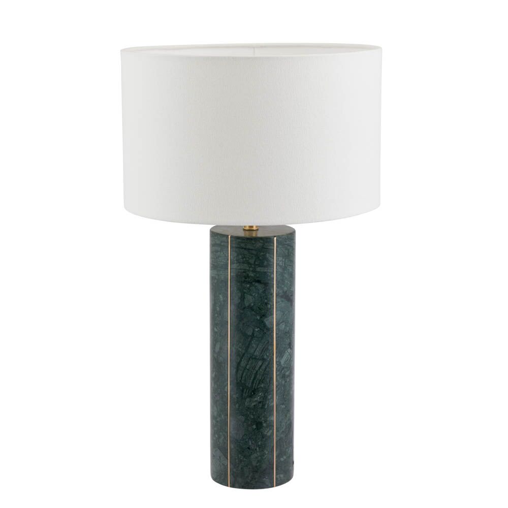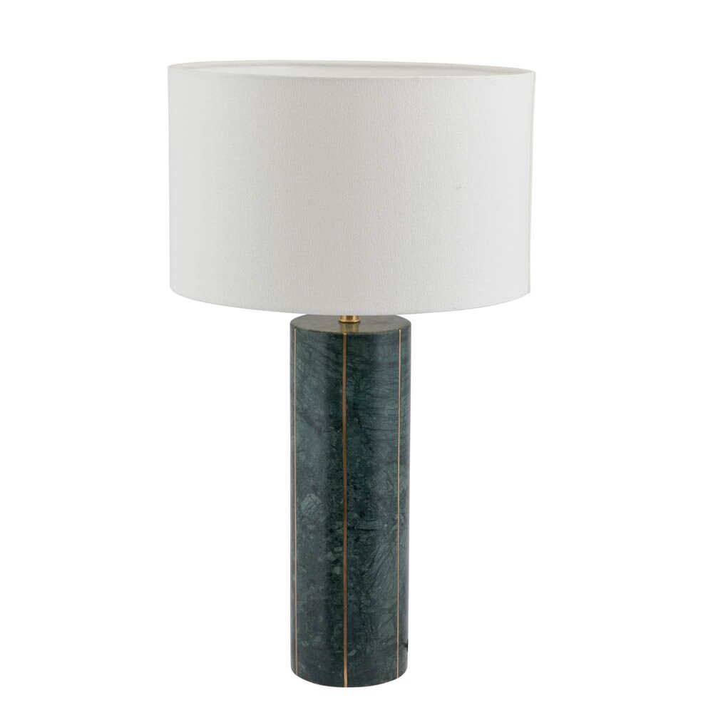 This stunning green marble table lamp with inlaid gold metal detail is perfect for any contemporary home. Complete with a textured cotton cylinder shade in white makes a real statement. Also available in another colourway.