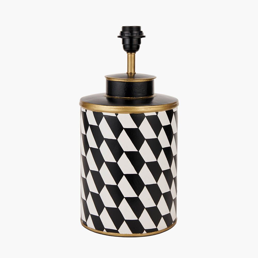 Our Victor metal table lamp base is another welcome addition to our handmade tea caddy table lamps. The on trend monochrome design on the lacquered iron base will make a stylish and quirky statement in any interior. The wonderfully versatile black and white geometric design will look fabulous with a range of shades, whether it be tonal or contrasting colour. We recommend a 35cm diameter shade.