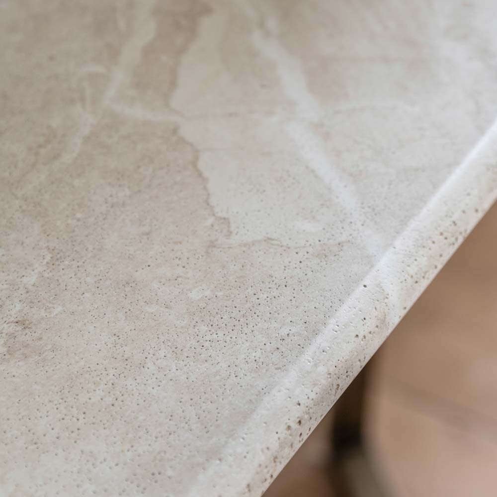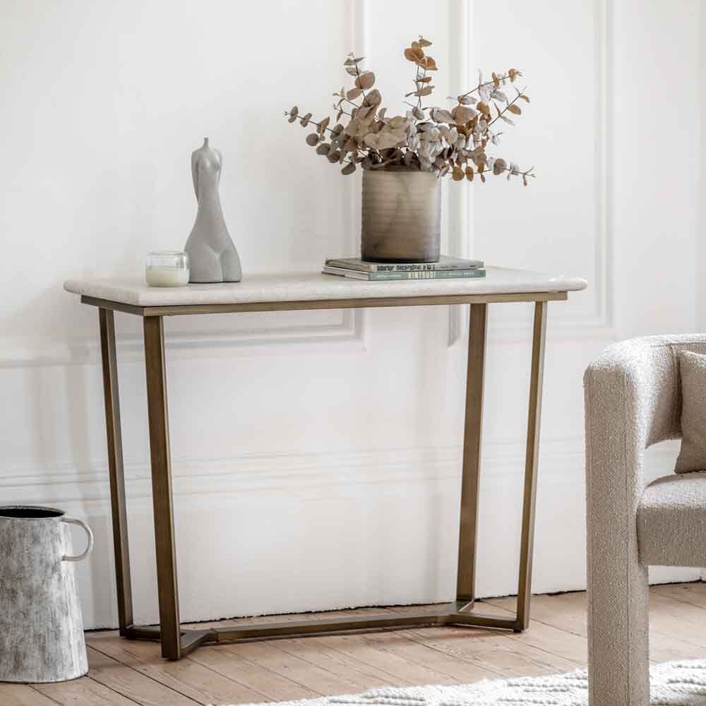 Add a touch of sophisticated elegance to a room with this lovely console table. The top features the most amazing travertine faux finish which is created with the latest state of the art technology to give the look and feel of the real thing but without the weight and technical difficulties. The faux travertine pairs beautifully with the metal legs and underframe which has a classy bronzed brass finish, to give an understated luxury style, perfect for any classic modern interior. Matching items also available.