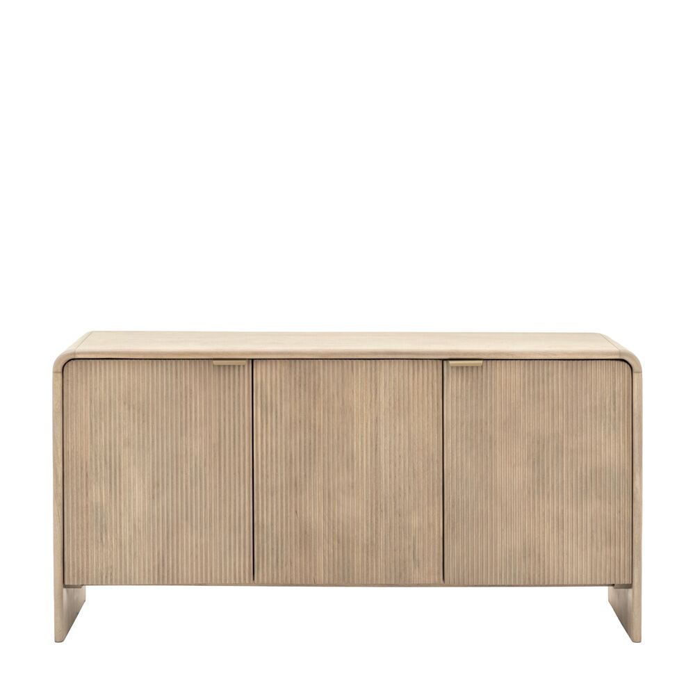 This 3 door sideboard is designed to bring both style and storage to any dining room or living space. With a beautifully curved top and signature fluted doors, this piece provides generous storage space behind its three doors. Whether used for dinnerware, media storage, or other household items, the sideboard?s refined design complements a wide range of interior styles.