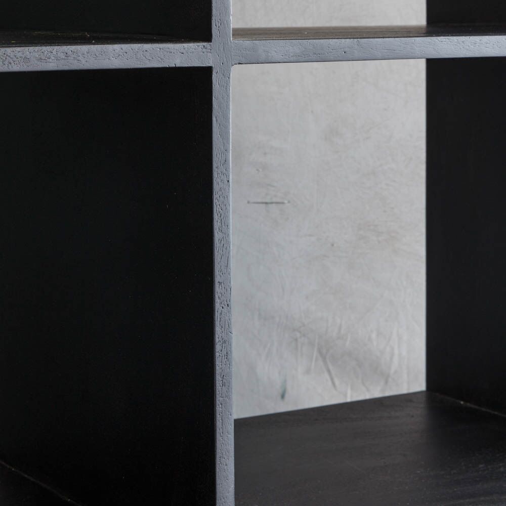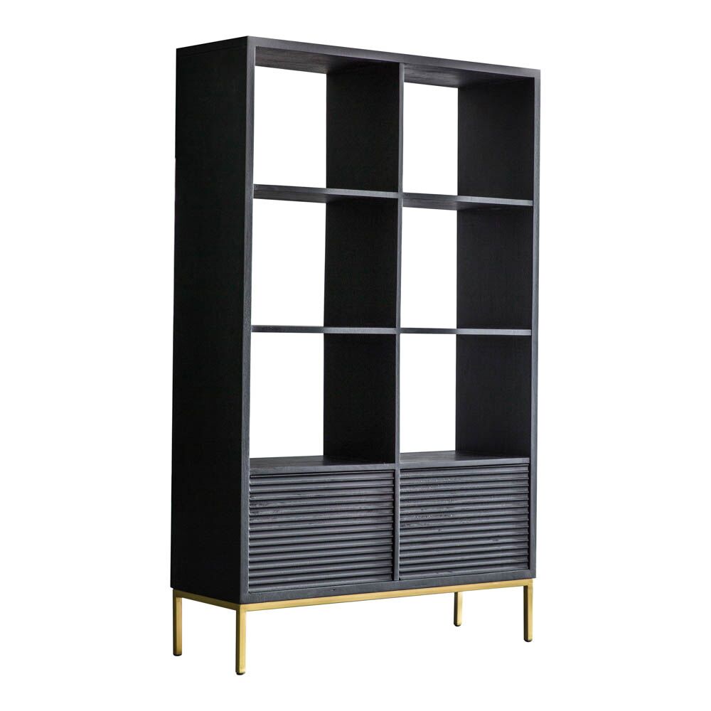 This open display unit features solid mango wood doors in a black finish, routed to create a ripple effect which catches the light, and open shelves, combined with a gold-finish metal base, to give a stylish yet practical unit which looks fantastic as a stand-alone piece or paired with other items from the collection.