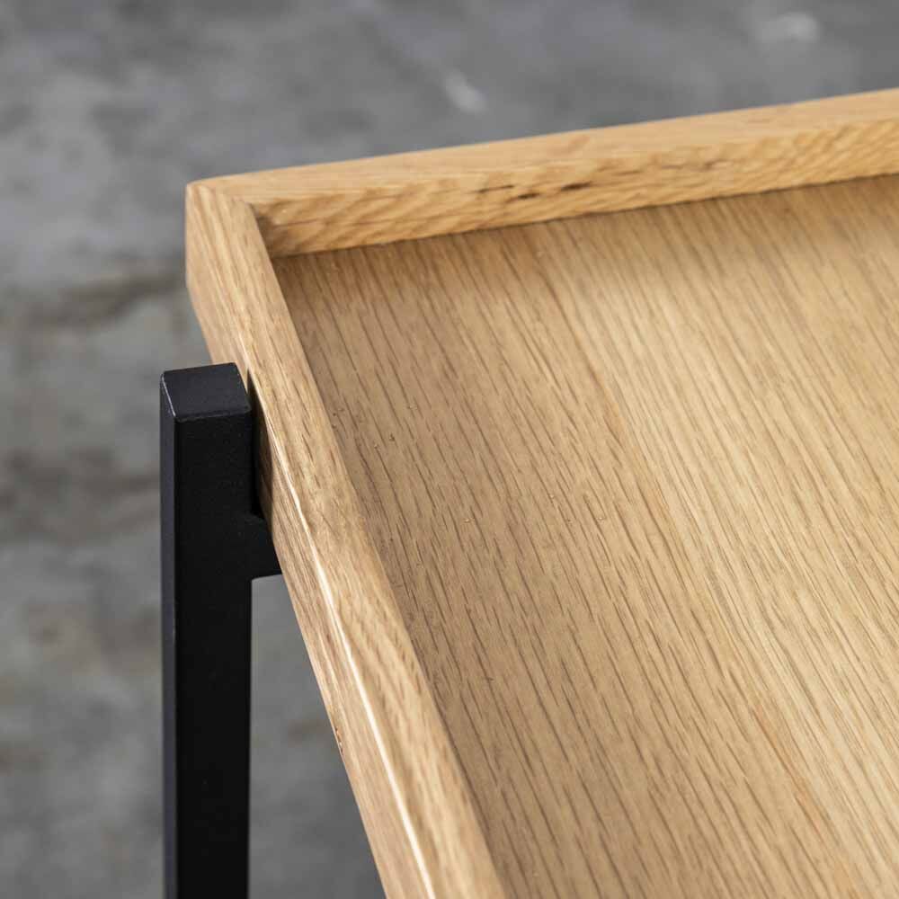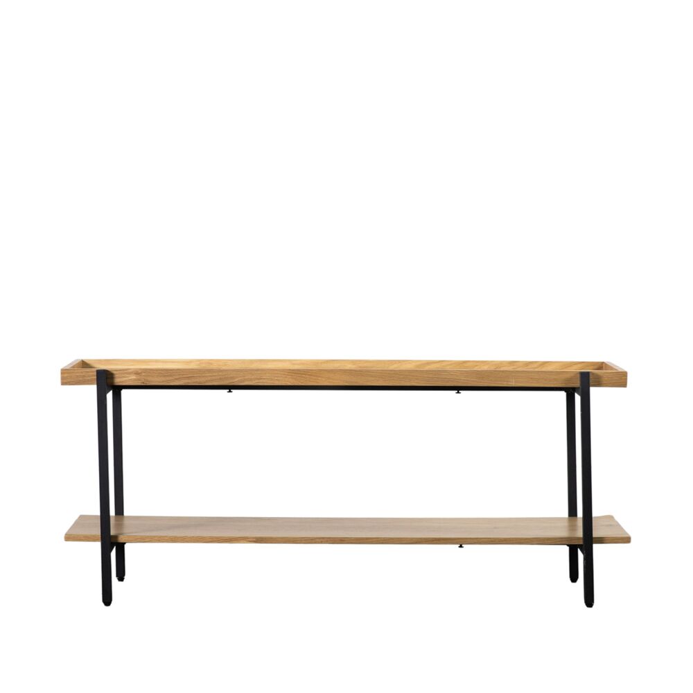 Offering a stunning contemporary look, this media unit combines matt black metal with oak. The table top and shelf are tray-style with oak veneer tops and solid oak surrounds. Matching pieces are available.