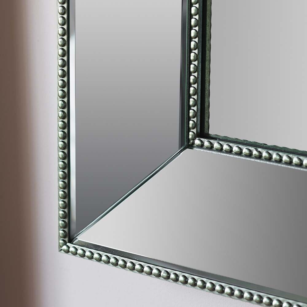 Dramatic wide mirror frame with deep angled profile and lightly antiqued silver finish
