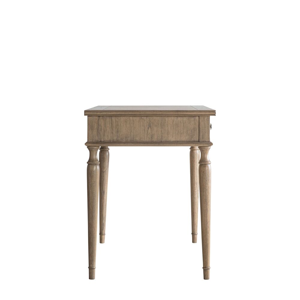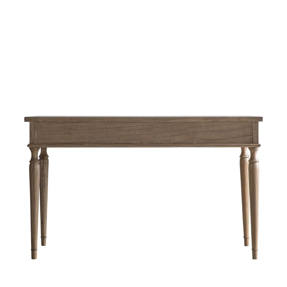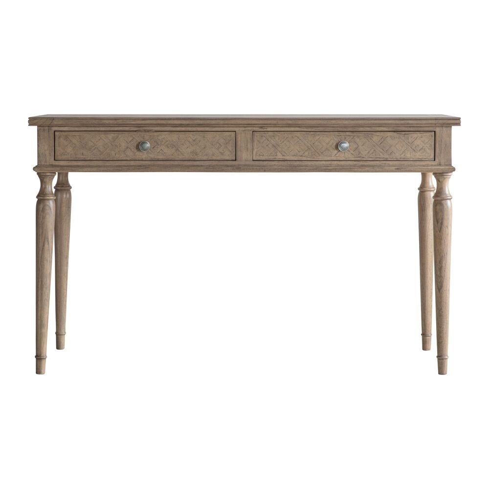With its beautiful inlaid parquet design and elegant turned legs, this 2 drawer desk oozes effortless style and appeal. Made from Mindy wood which is lightly brushed to recreate a natural ageing effect, its subtle finish and classy design suits a range of interiors. The 2 drawers add practical storage, to help keep tidy.