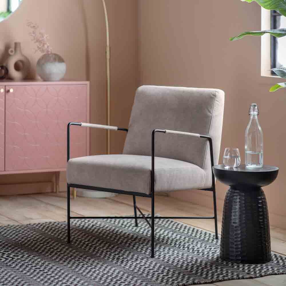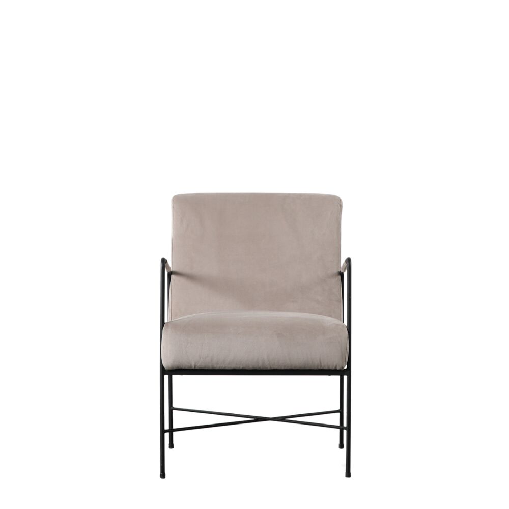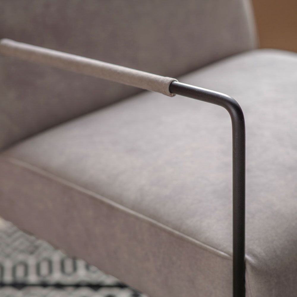 Contemporary armchair with a black metal frame paired with an upholstered seat and back. With the narrow metal arms featuring fabric wrapped detail, it is perfect for apartment living or other smaller spaces. The armchair is also available in white.
