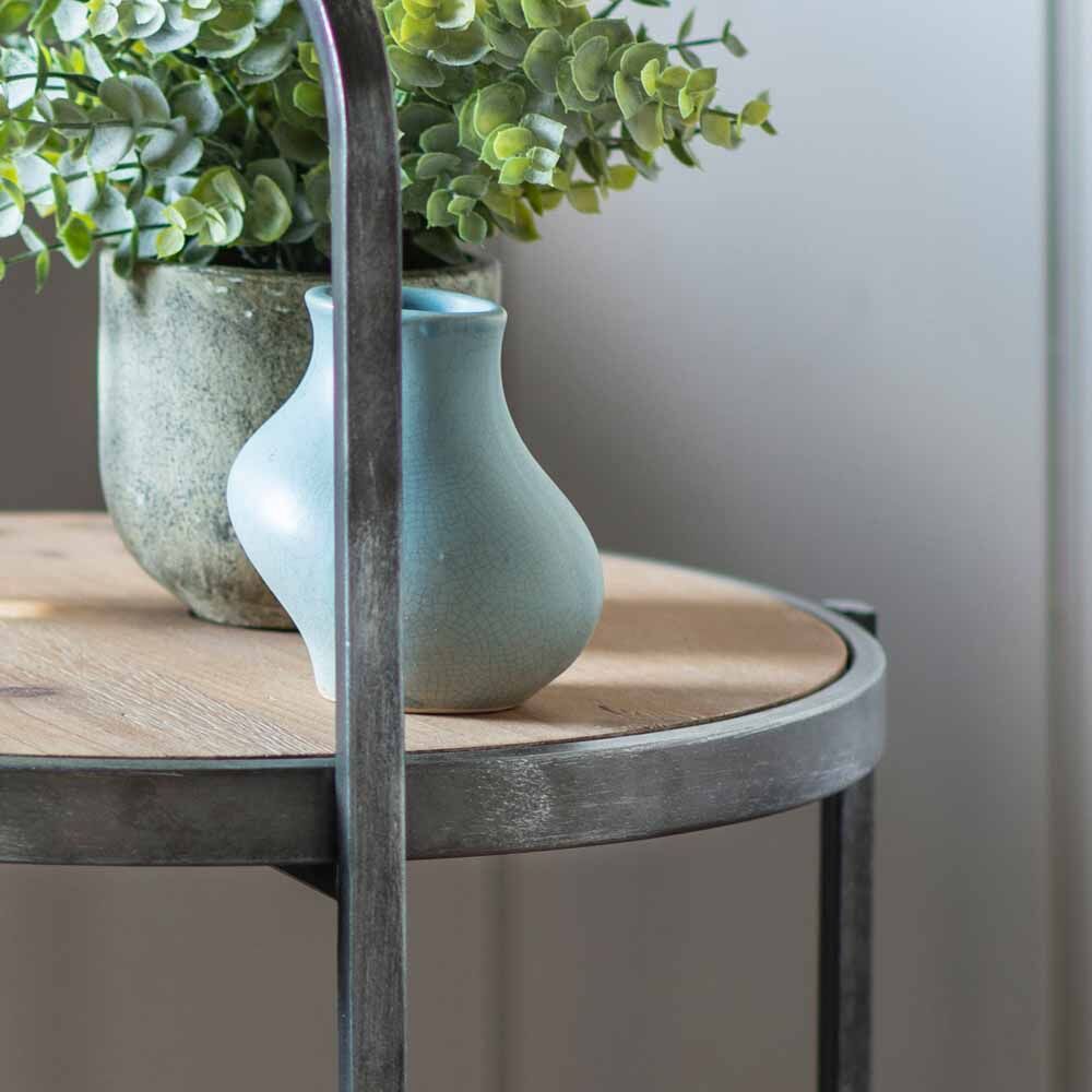 Contemporary side table crafted from metal with an antique pewter finish combined with a fir veneer top and shelf with a natural finish with a light wash to highlight the grain of the wood. The unusual design features a continuation of one section of the base, up and over the tables to create a ‘handle’ effect.?