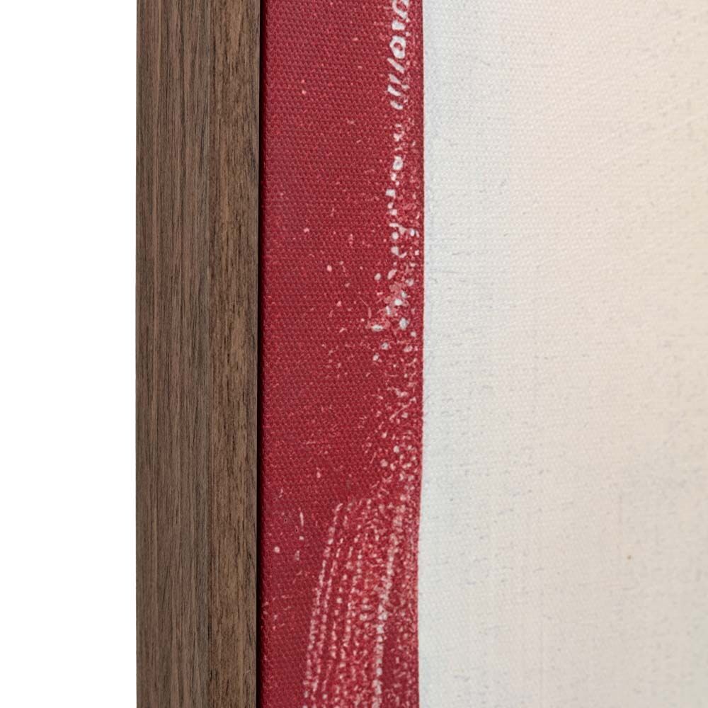 Make a bold statement with this striking piece, featuring a vibrant ruby red palette and dynamic abstract shapes, creating a captivating focal point for any room.