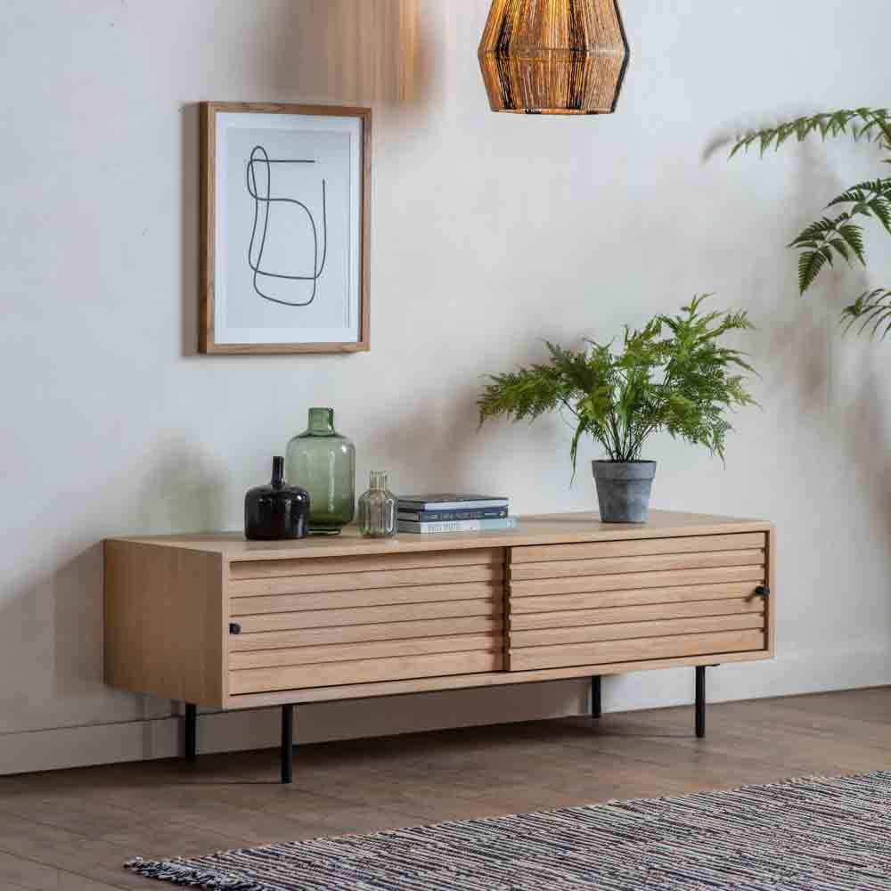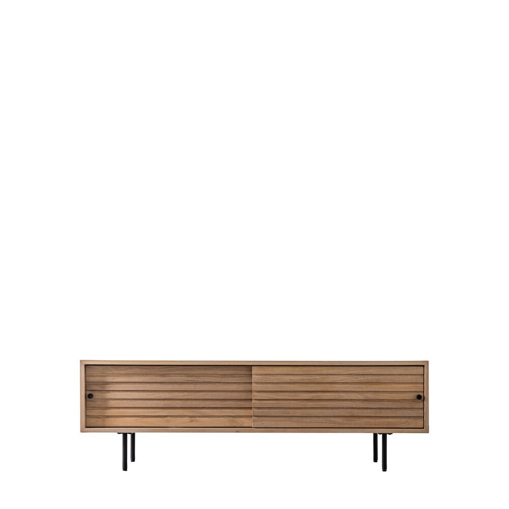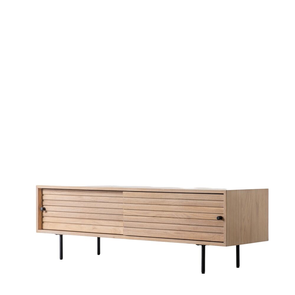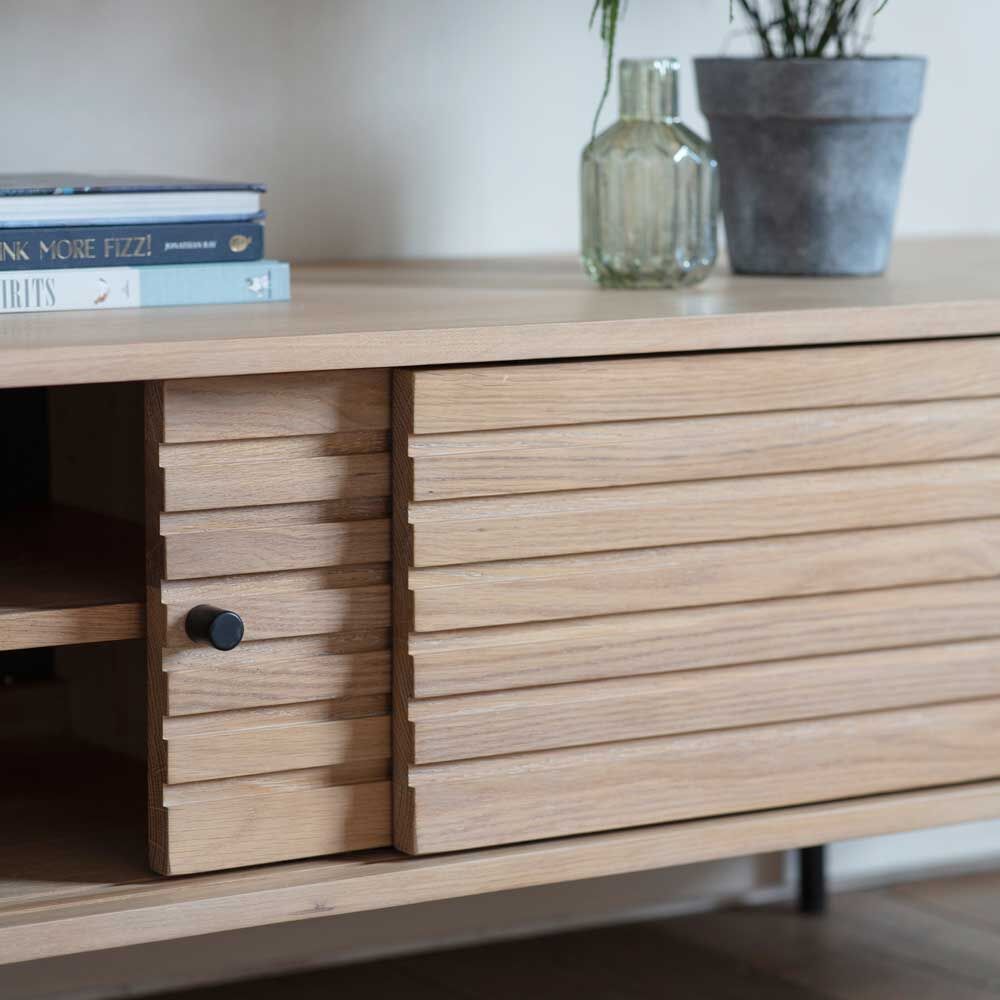 This media unit features sliding doors crafted from solid oak with routing detailing to echo the slats of other pieces in the range. Black metal legs and handles add the finishing touch.
