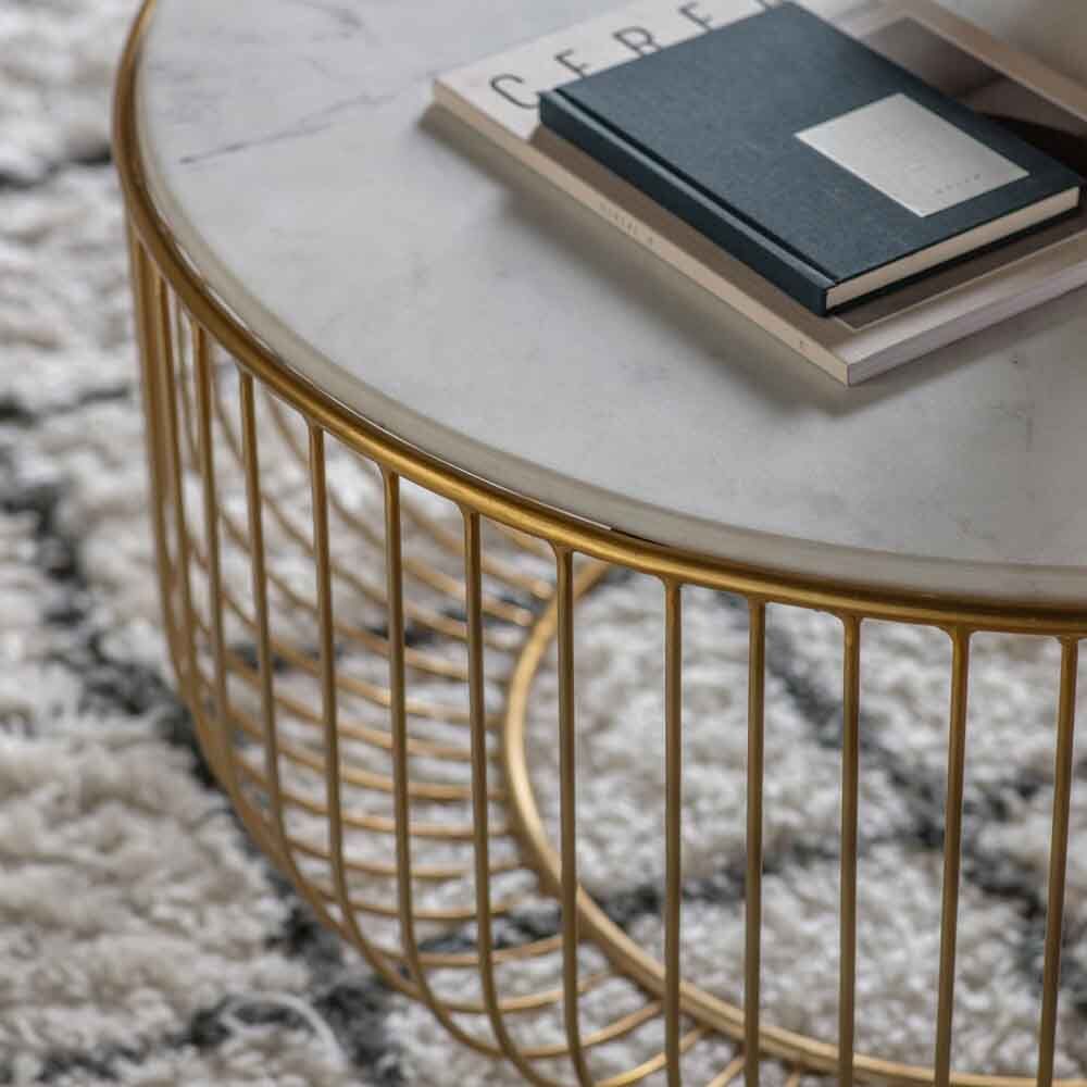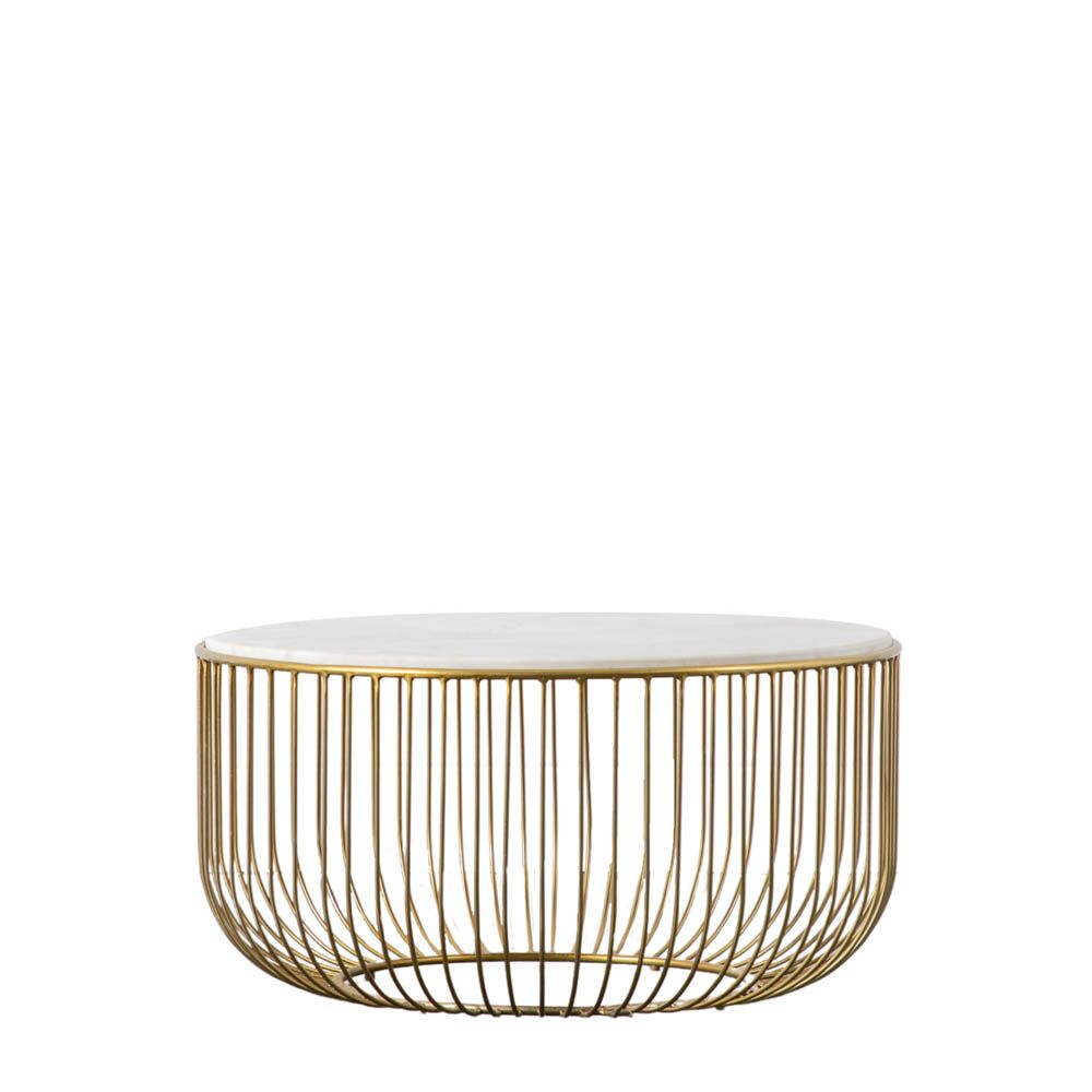 Add a touch of Luxe to a room with this lovely coffee table which combines a distinctive fine wire metal base in a brushed brass finish with a white marble top, to create a sophisticated piece to add a touch of glamour to a room. A matching side table is available, and both are also offered with black bases.