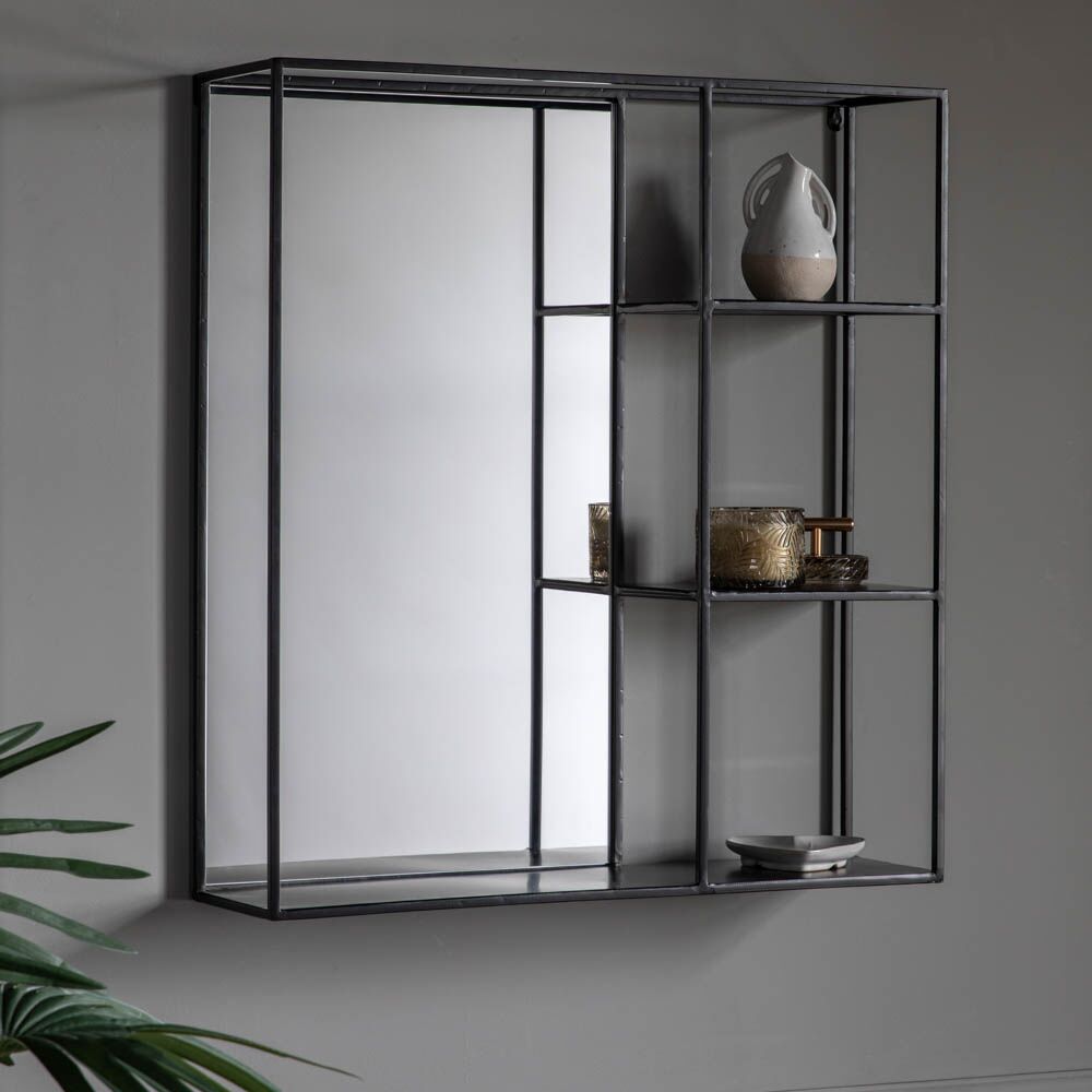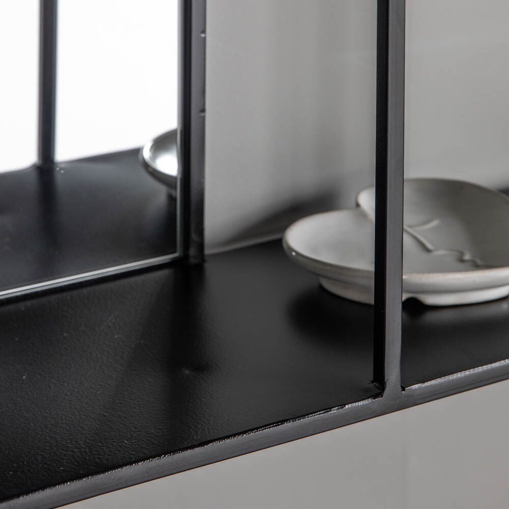 Functional rectangular mirror with a sleek and fashionable design, featuring handy shelving and bold black framing. Perfect for a bathroom set up or as a decorative lounge or bedroom space.