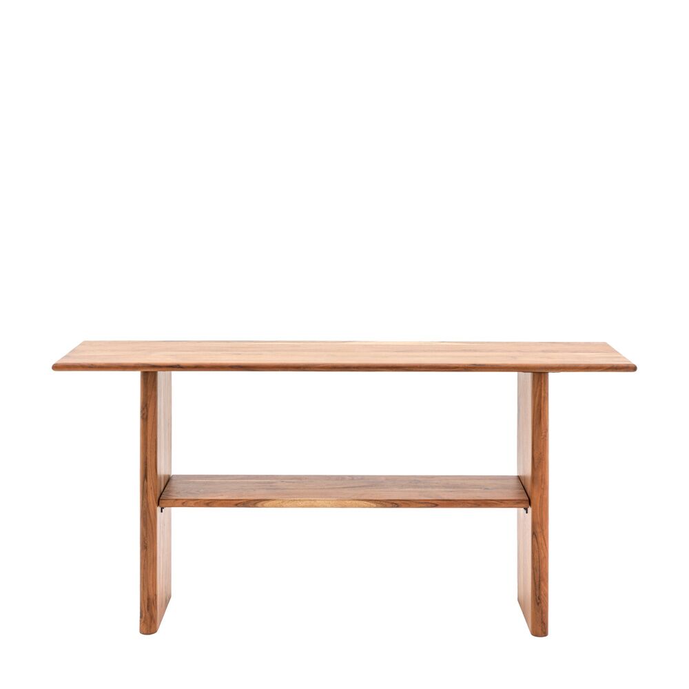 The simple design of this console table lets the richly grained Acacia wood speak for itself, with a wide top and legs showing off the beautiful wood. An additional lower shelf for extra storage makes this Console table a practical and stylish addition to any room. Coordinating further furniture pieces also available.