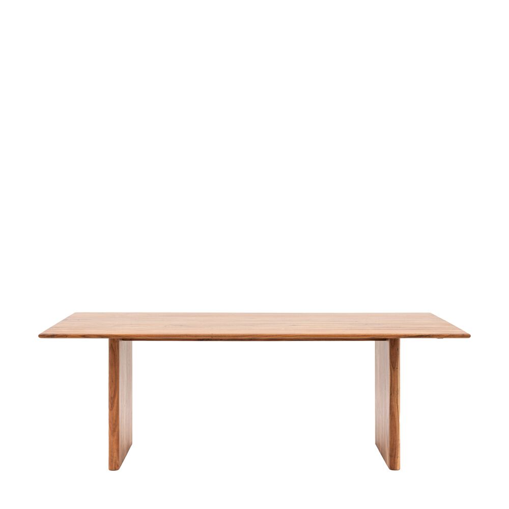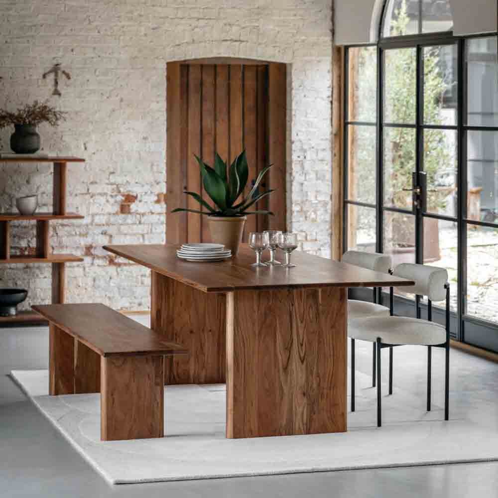 Stunning contemporary design dining table. Crafted from solid acacia wood with a warm natural finish which shows off the beautiful grain of the timber, the table offers a sturdy yet elegant look. The solid legs have soft curved ends and the tops have rounded edges to echo this. The table is available in a smaller size and there are also two sizes of dining bench.
