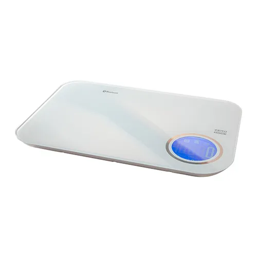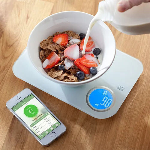 The smartphone app connects to the scale and transfers information to your phone to keep track of daily nutrition values like protein, carbs, fats, fibre and sodium.