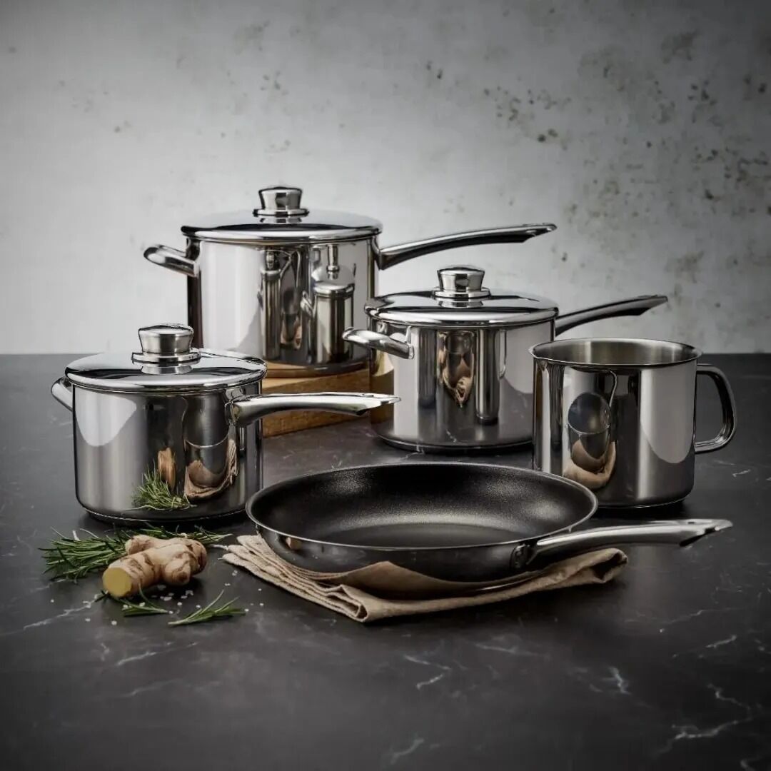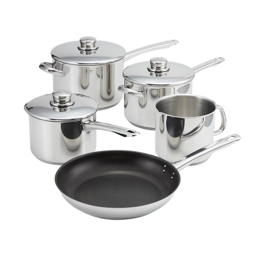 Meet our Classic 5 Piece saucepan set, containing a 14cm Sauce Pot, 16cm Saucepan, 18cm Saucepan, 20cm Saucepan and a 26cm Conical Frying Pan Non-Stick