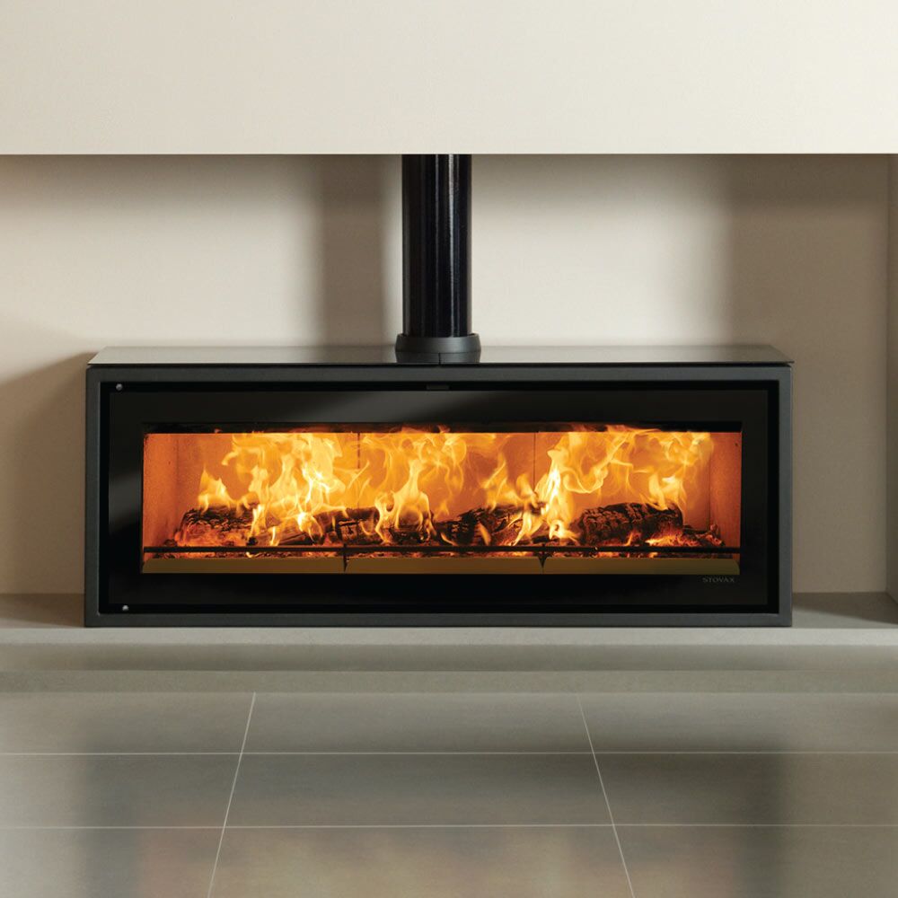 The largest in Stovax’s Studio range is the striking Studio 3 Freestanding Ecodesign wood burning stove. This highly efficient and visually impressive wood burning stove has the same 11kW of heat output and stunning widescreen views of the flames as its inset fire equivalent but offers a very different look.