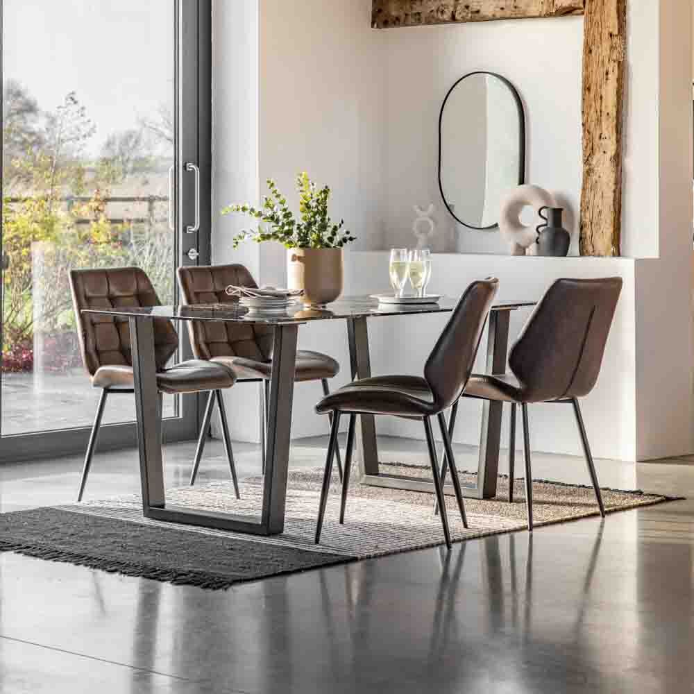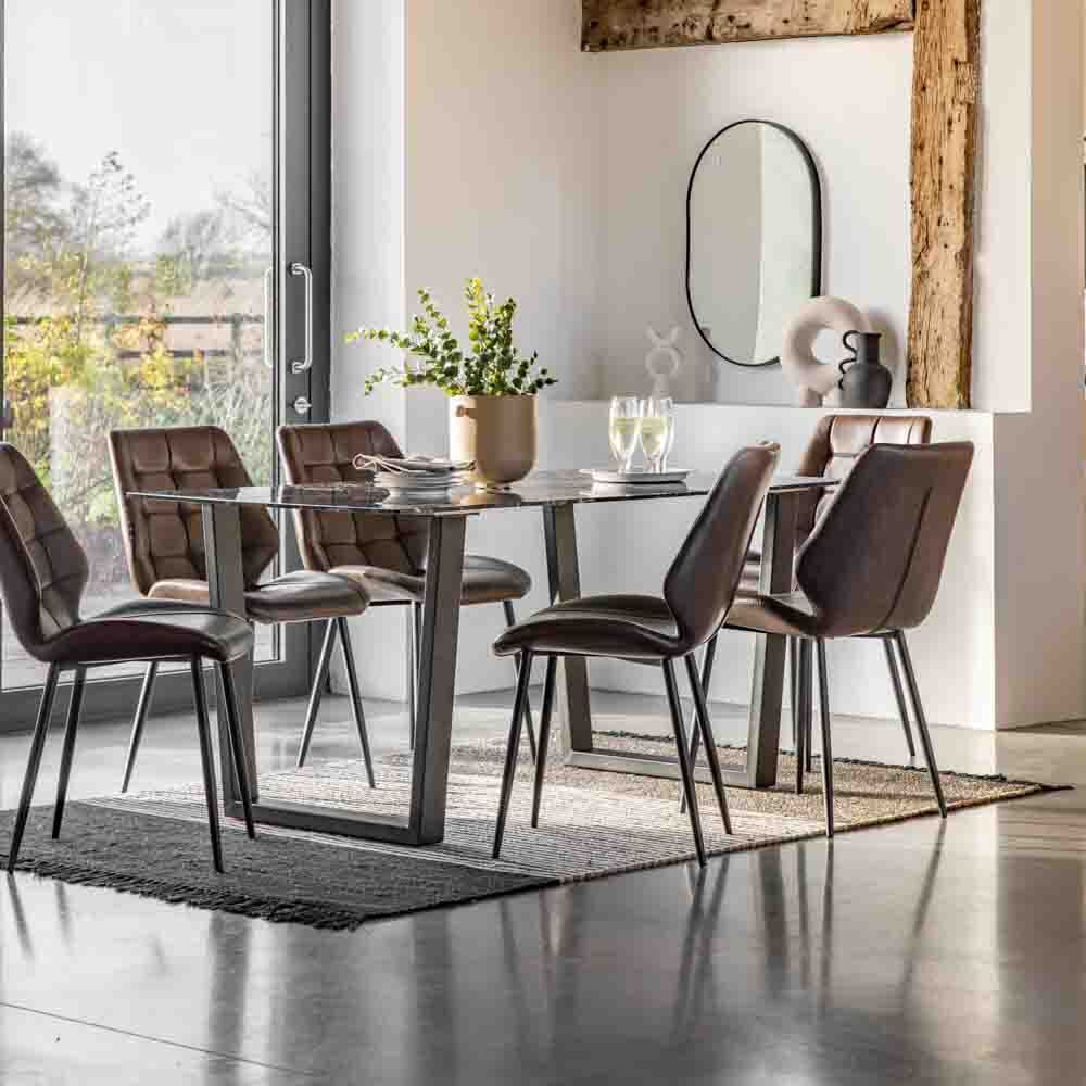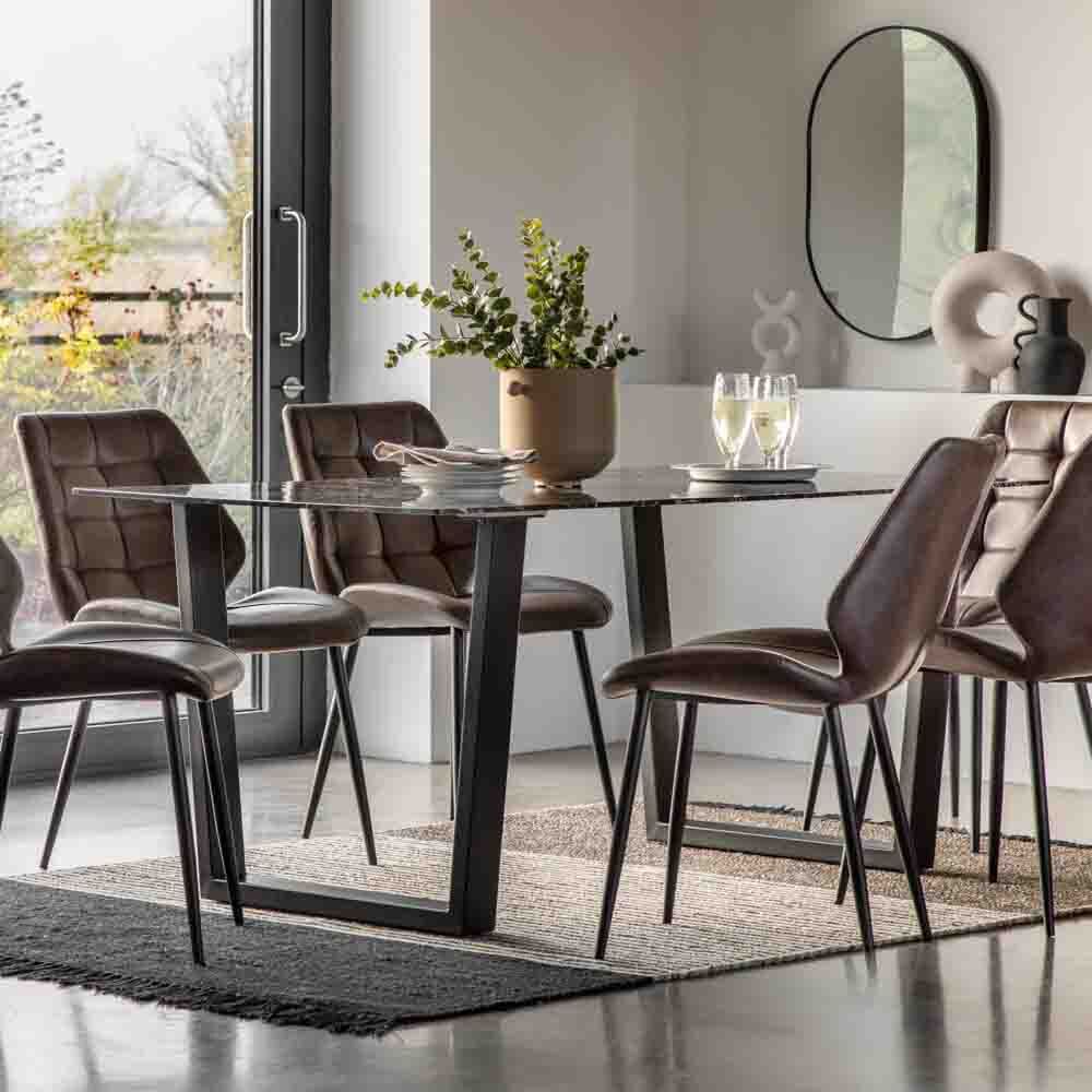 Stunningly modern and sophisticated, this table features a classic faux black marble glass top and distinctive angled black legs, creating a contemporary and stylish table you won’t be able to take your eyes off. Perfect for bringing a modern touch to any dining space, the table seats 6.