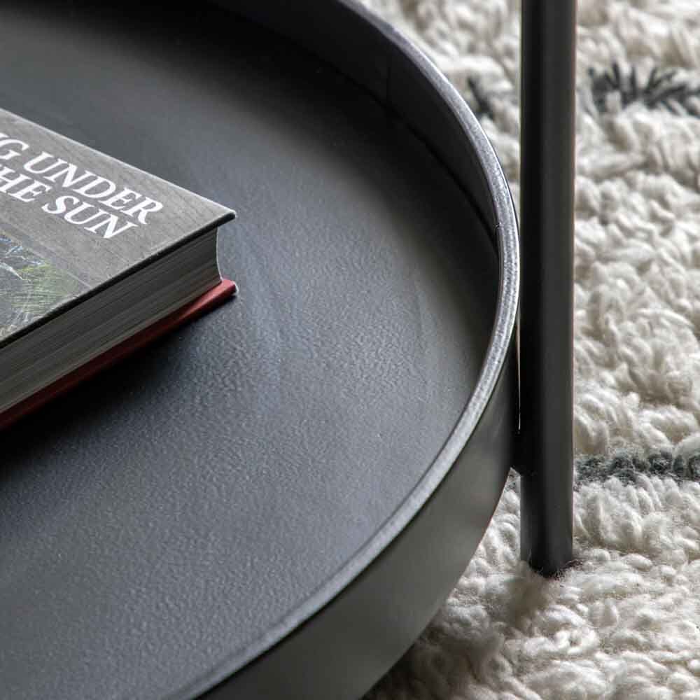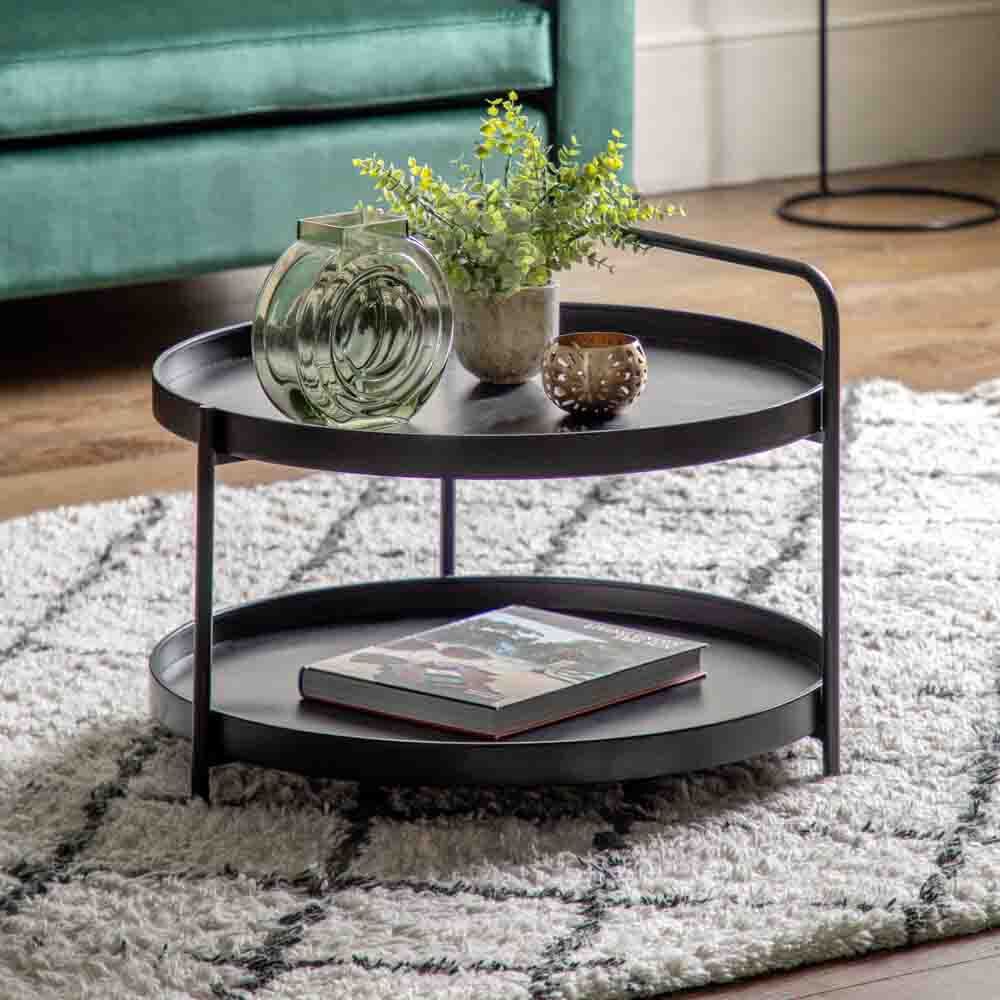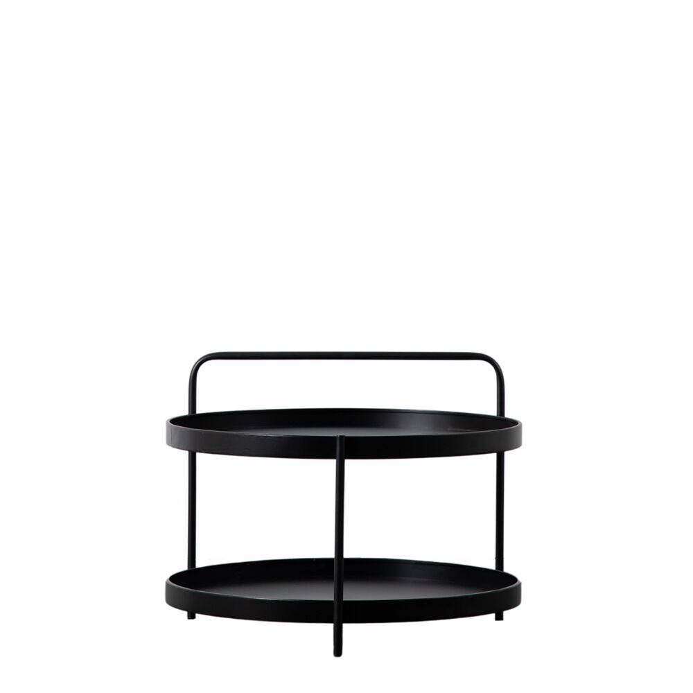 Contemporary coffee table crafted from metal with a black finish, with a tray-style top and lower shelf. The stunning design features a continuation of one section of the base, up and over the table to create a ?handle? effect. A matching side table is available and both are also offered in a gold leaf finish.