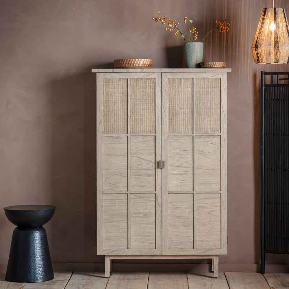 Developed with Japandi influences to give the ideal fusion of Japanese and Scandinavian design. The perfect range to add a touch of unique style to any interior, featuring a traditional lightly weathered finish with modern slatted detailing, cane panel inserts on some doors and brushed bronze handles. This two door cupboard features handwoven cane inset into the top section of the doors, paired with Mindy ash solids and veneers, in a soft natural colour. Also including a sideboard, media unit, coffee and console table, plus a practical supper table and unique slatted side table, this collection adds a touch of simplistic minimalisation to any interior space.