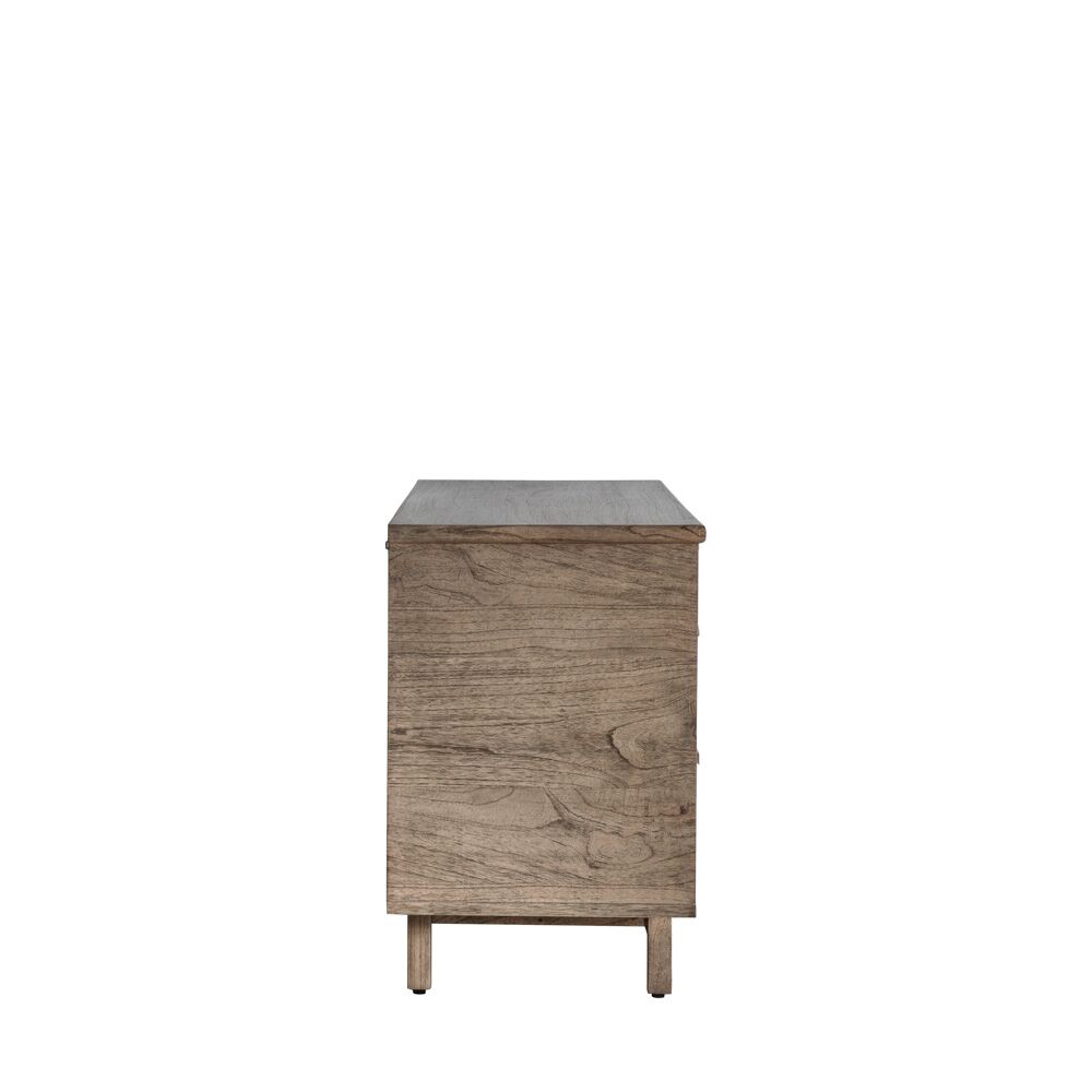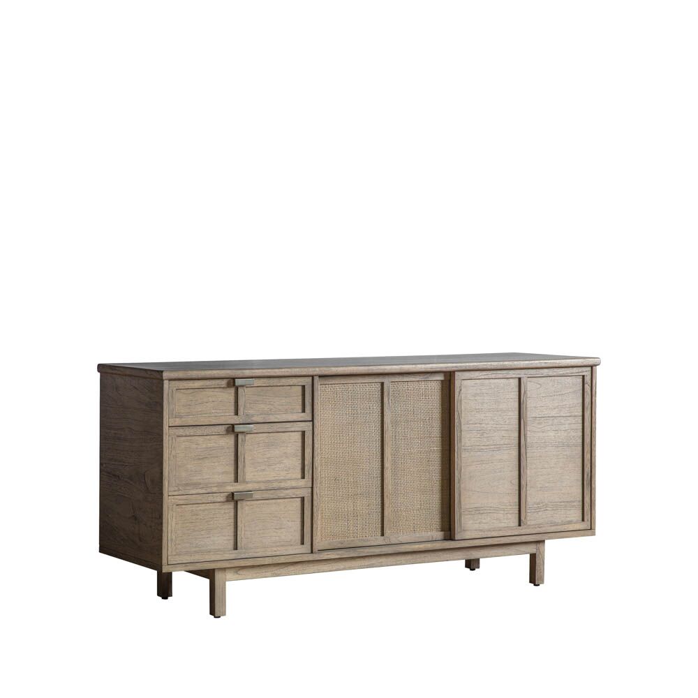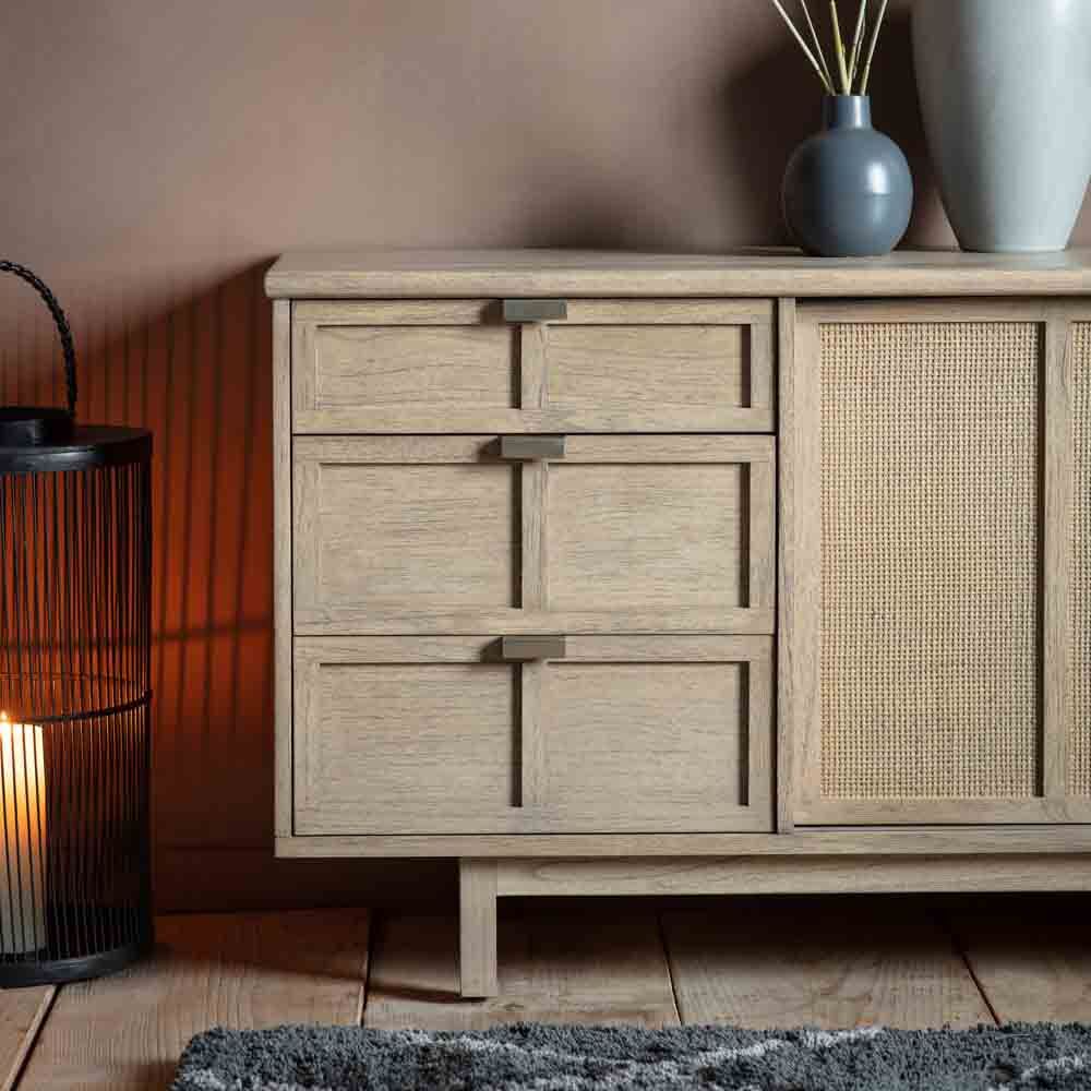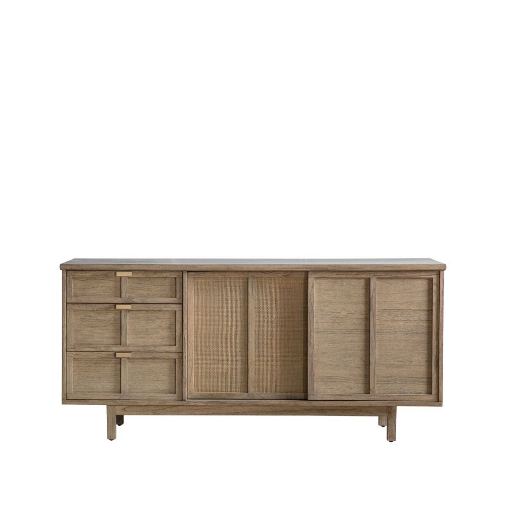 Developed with Japandi influences to give the ideal fusion of Japanese and Scandinavian design. This stylish sideboard, which is crafted from Mindy ash solids and veneers, features three drawers and two sliding doors. This is the perfect range to add a touch of unique style to any interior, featuring a traditional lightly weathered finish with modern slatted detailing, hand-woven cane inserts and brushed bronze handles. Also including a media unit, cupboard, coffee and console table, plus a practical supper table and unique slatted side table, this collection adds a touch of simplistic minimalisation to any interior space.