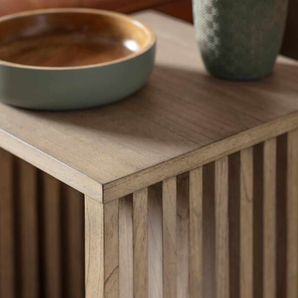 Developed with Japandi influences to give the ideal fusion of Japanese and Scandinavian design. This beautiful side table, crafted from Mindy ash, features slatted sides, adding a stylish design feature. This is the perfect range to add a touch of unique style to any interior, featuring a traditional lightly weathered finish with modern slatted detailing, hand-woven cane and brushed bronze handles. Also including a media unit, sideboard, cupboard, coffee and console table, plus a practical supper table, this collection adds a touch of simplistic minimalisation to any interior space.