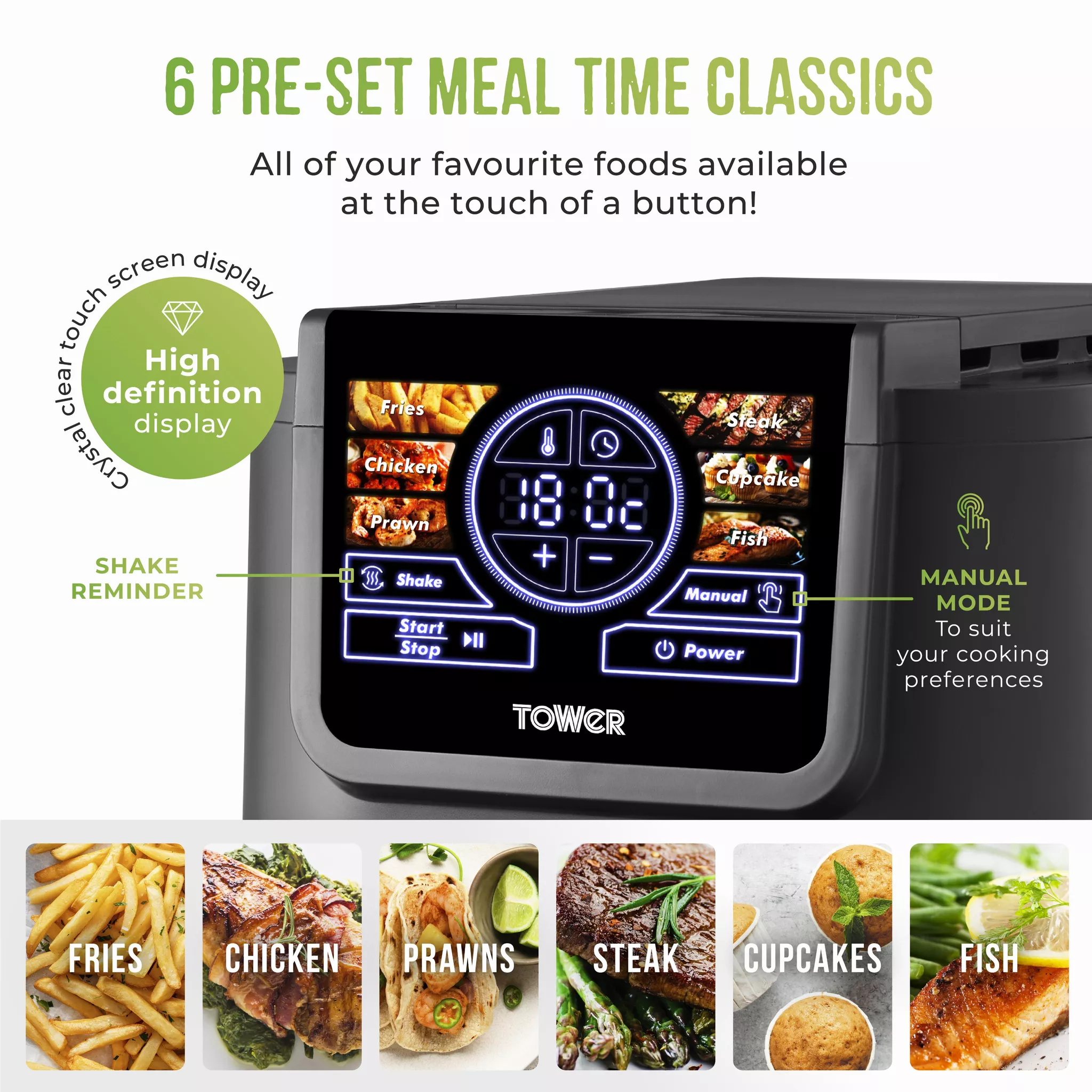 | Digital control panel with 6 preset cooking programmes to choose from | Up to 200C temperature and 60 minute cooking timer |