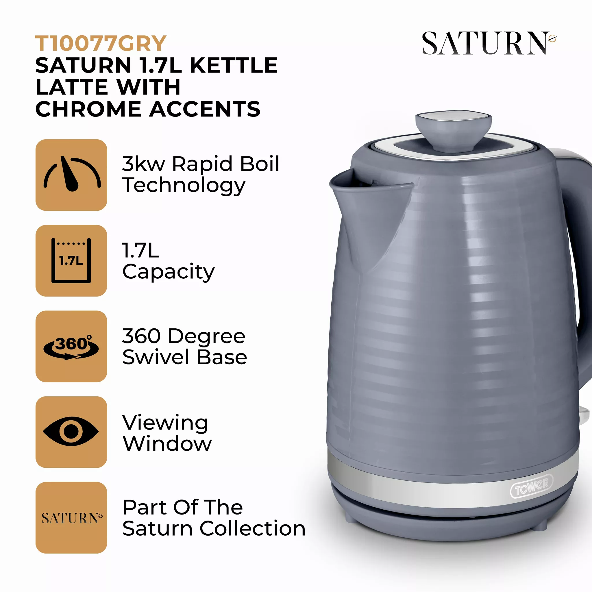 Tower T10077GRY Saturn Kettle with Quick Boil – 1.7L – 3000W – Grey and Chrome Accents