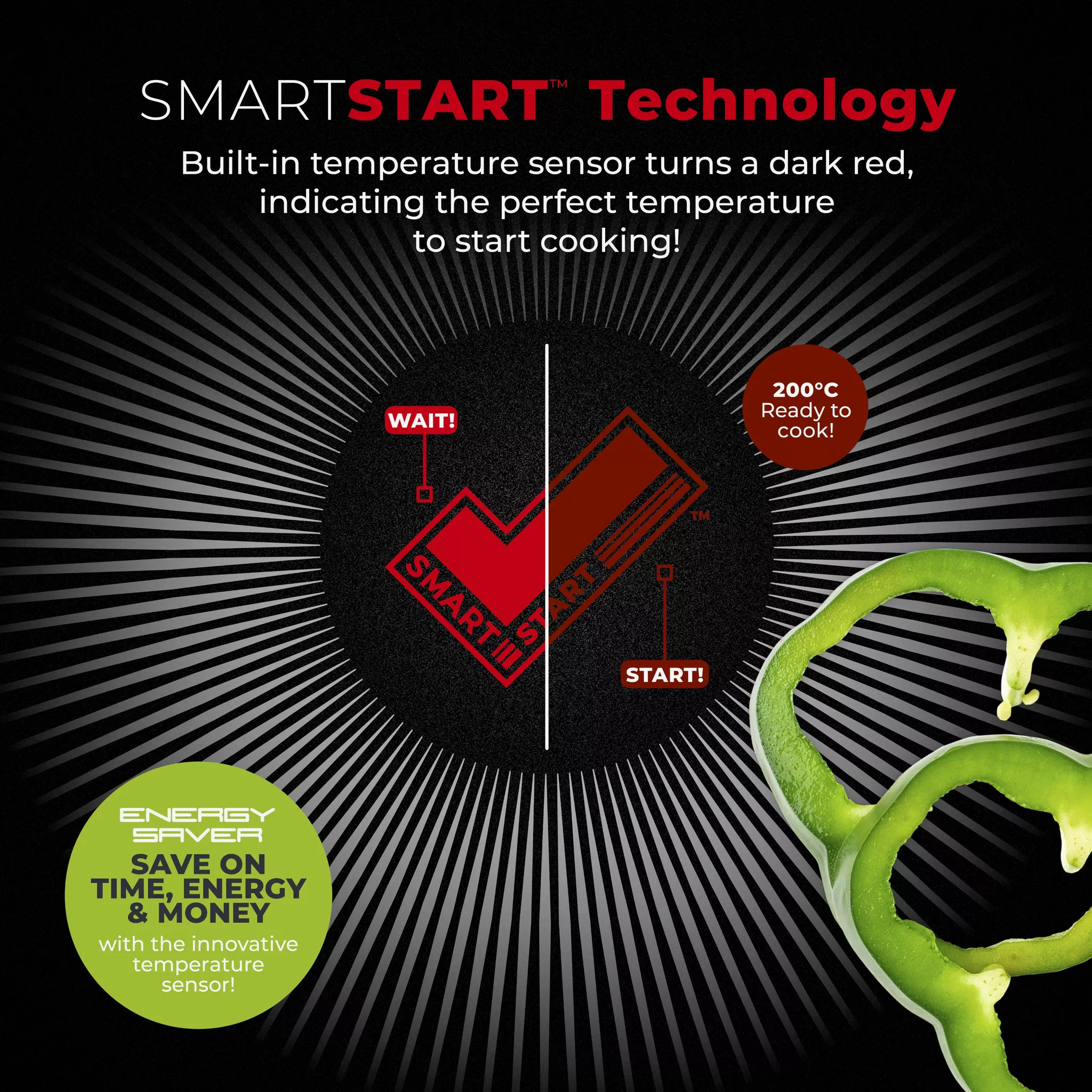 - A temperature sensor is built into the non-stick coating that changes to dark red as soon as the wok reaches the optimal temperature. Simply pop the wok on the hob to heat up, wait for the SmartStart tick to change to dark red and take the guess work out of cooking