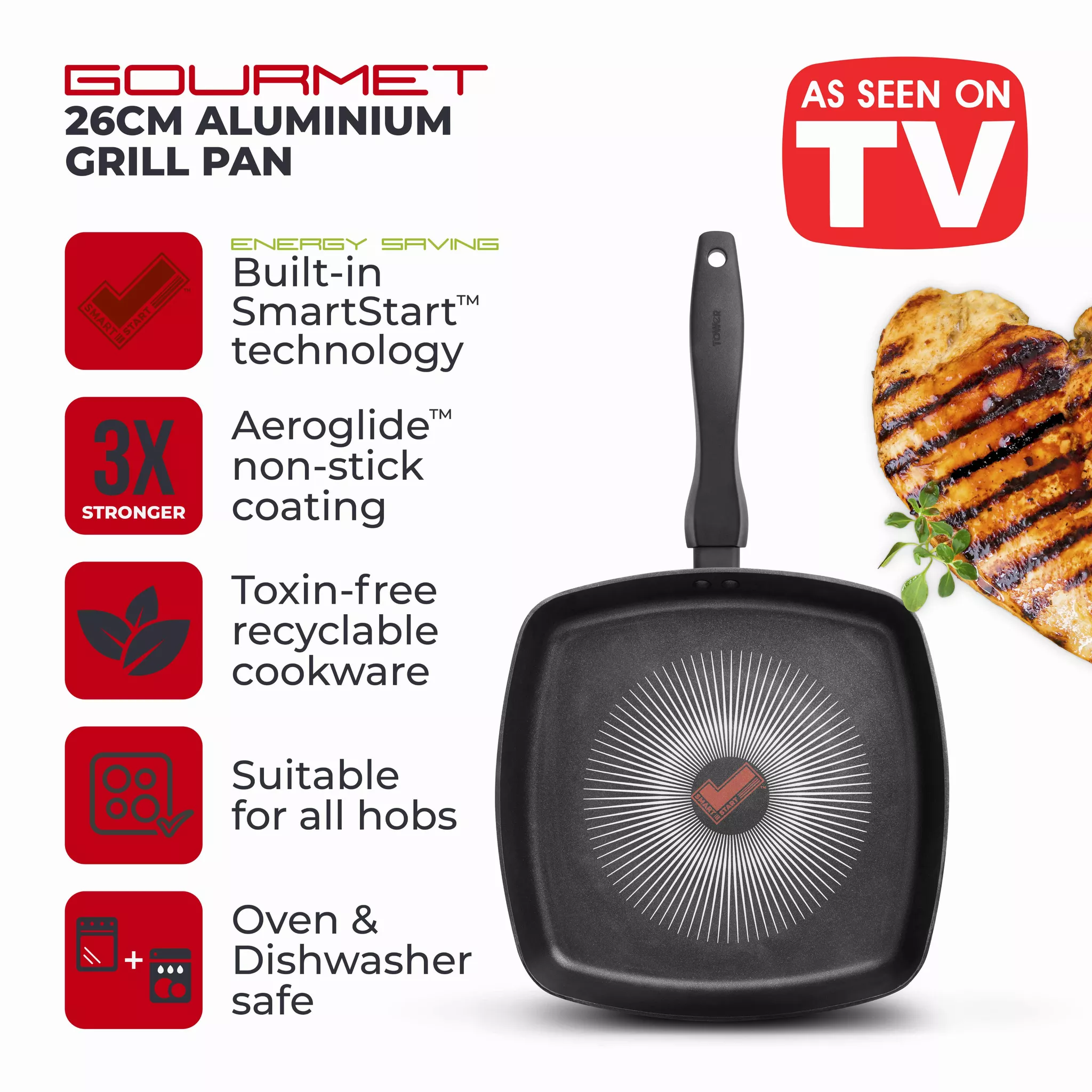 Tower T700317 SmartStart Gourmet 26cm Aluminium Grill Pan Induction Compatible – Oven Safe – Black