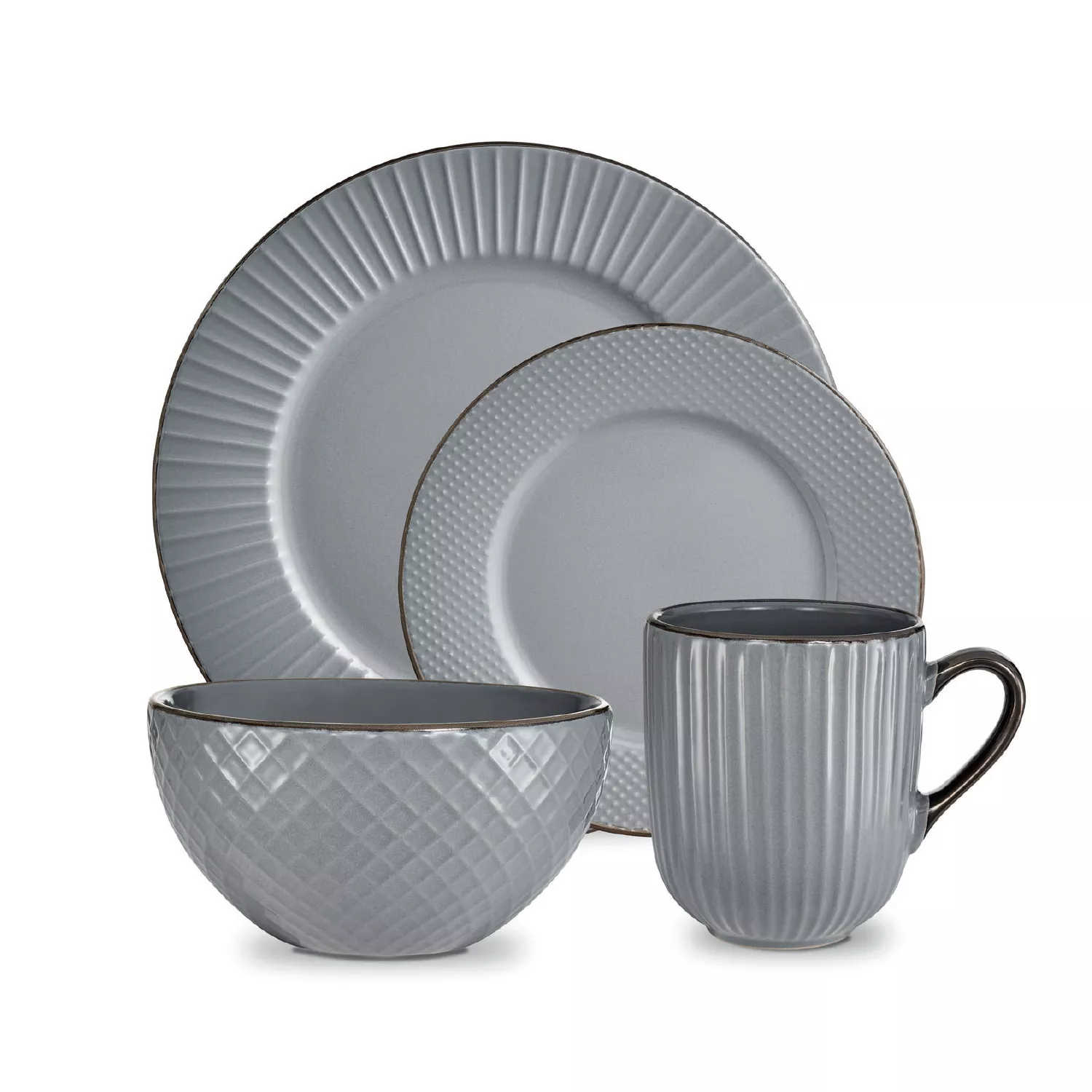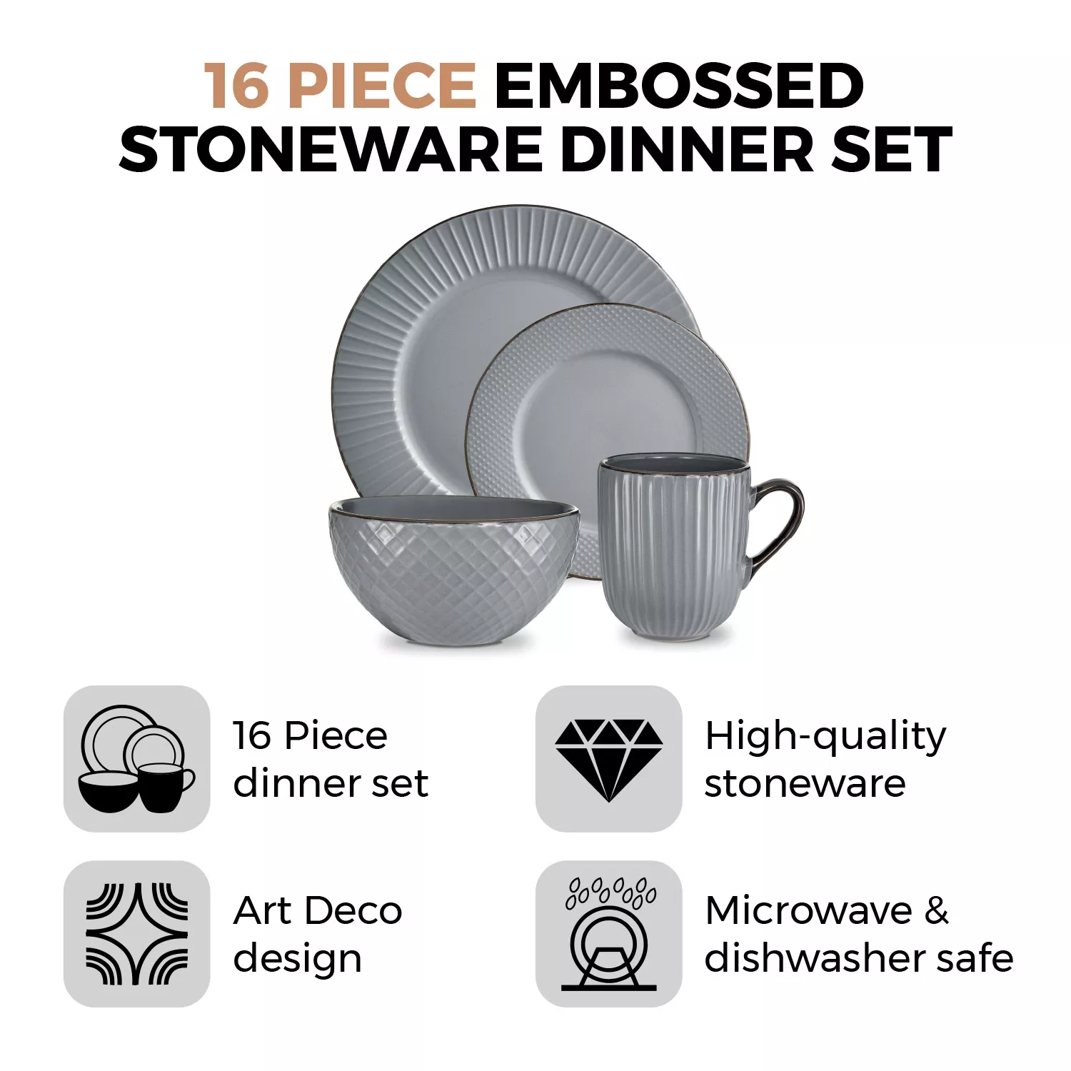 Tower T867002GRY 16 Piece Embossed Stoneware Dinner Set Grey