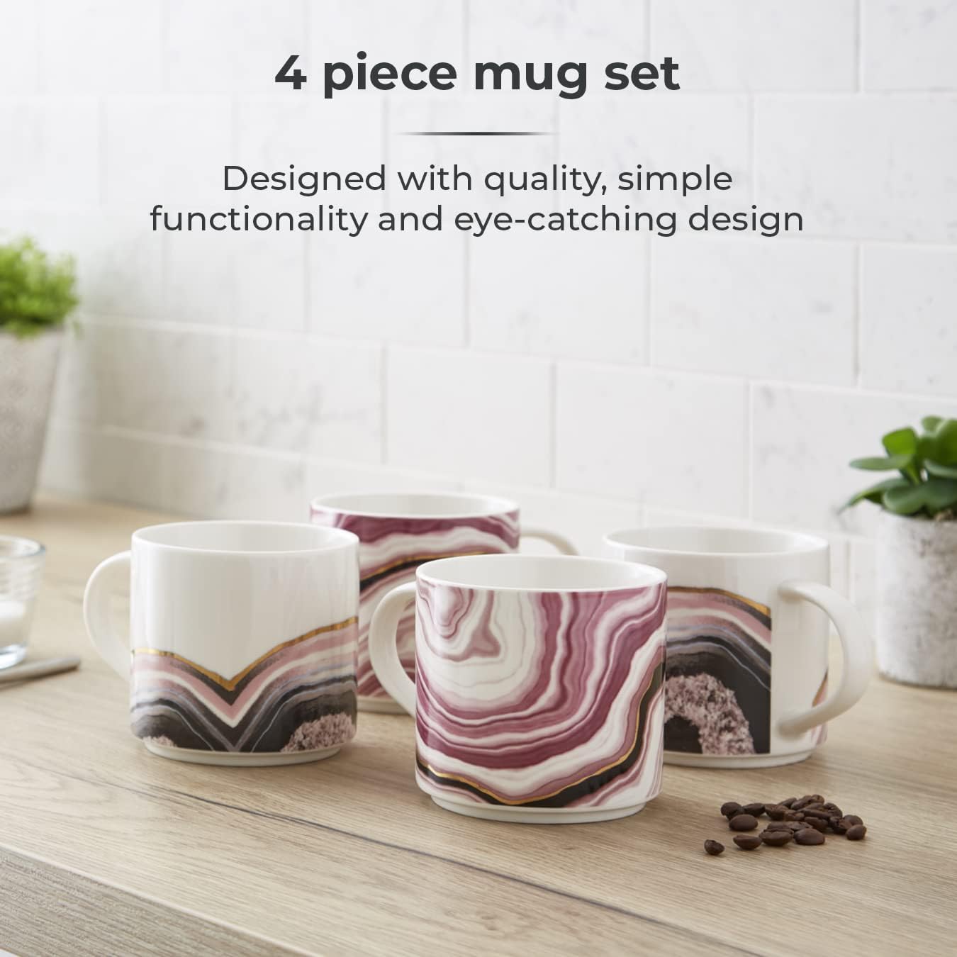 4 Piece Mug Set: Set of 4 mugs designed with quality, simple functionality and eye-catching design to add a touch of luxury to the breakfast table