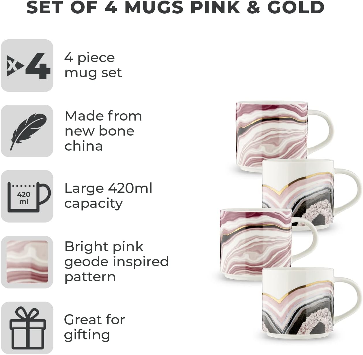Bright Pink Geode Inspired Pattern: Each mug features a unique geode inspired design in splashes of bright pink colour with a metallic gold finish
