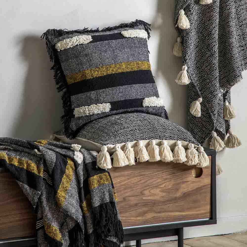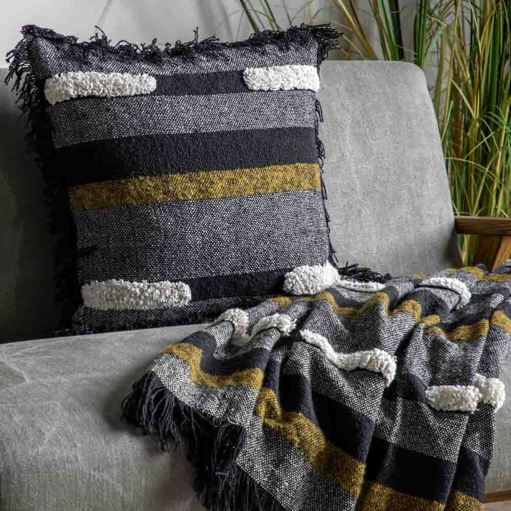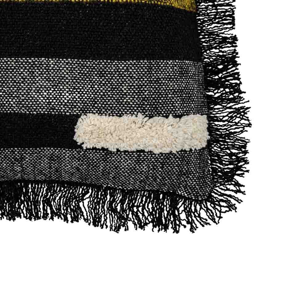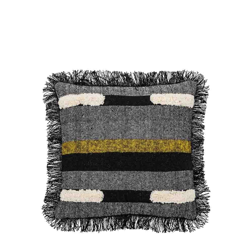 A stylish and contemporary cushion featuring blocks of different colour and fabrics and a delicate fringe around the edge.