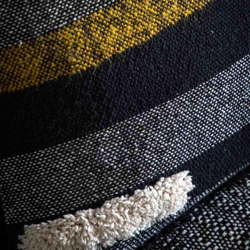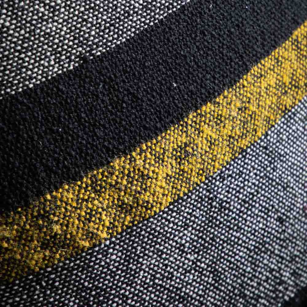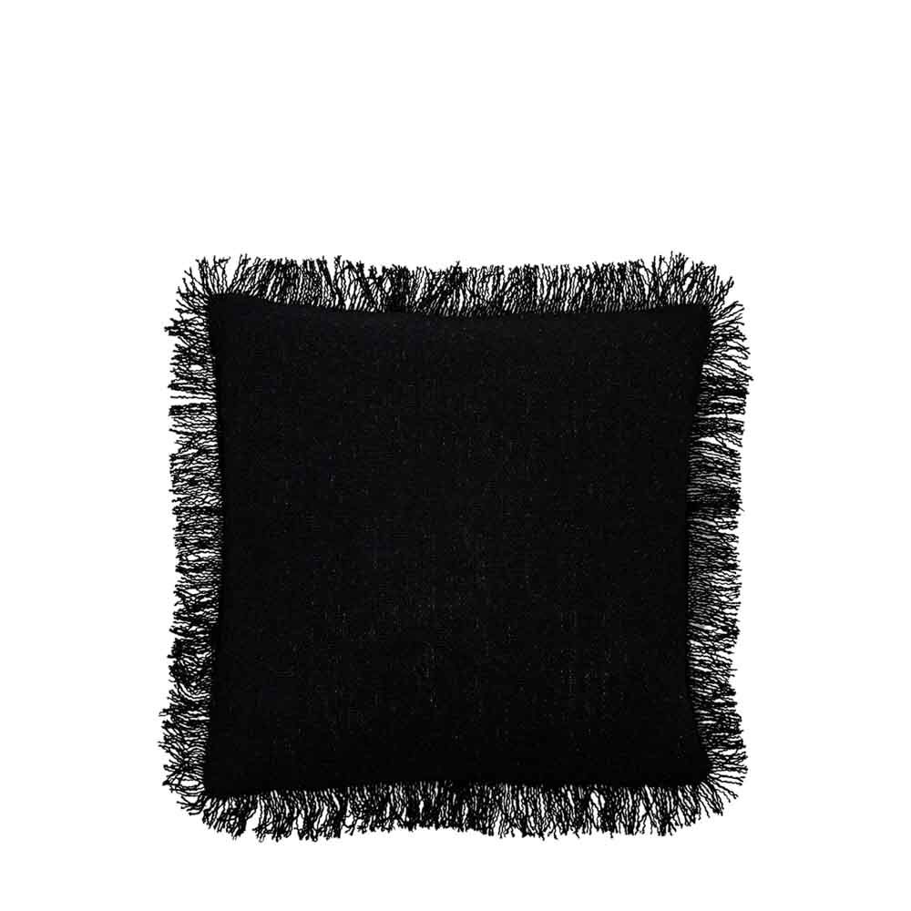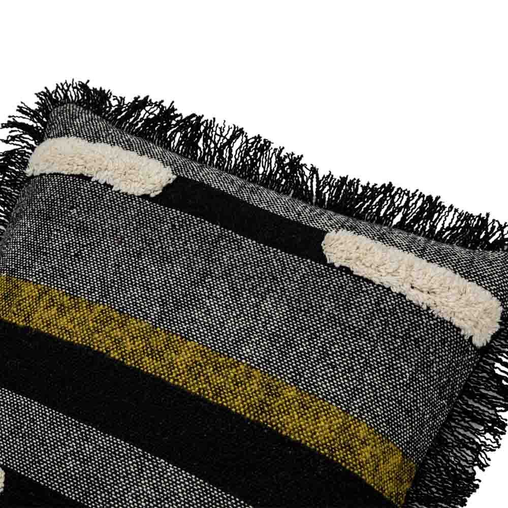 A stylish and contemporary cushion featuring blocks of different colour and fabrics and a delicate fringe around the edge.