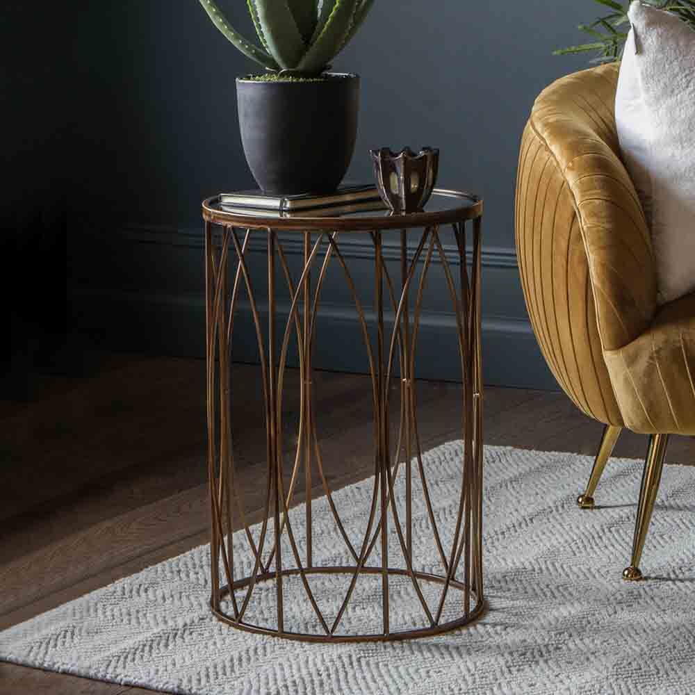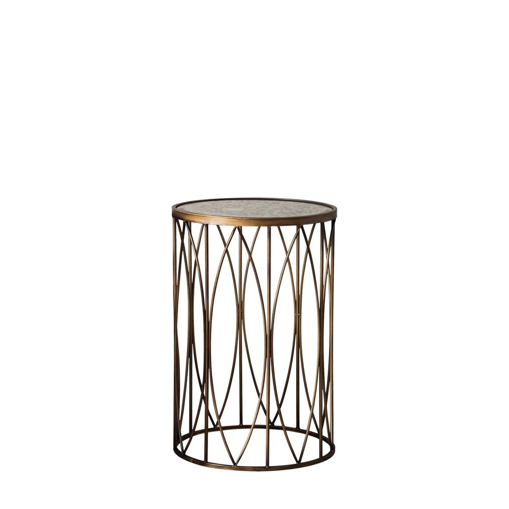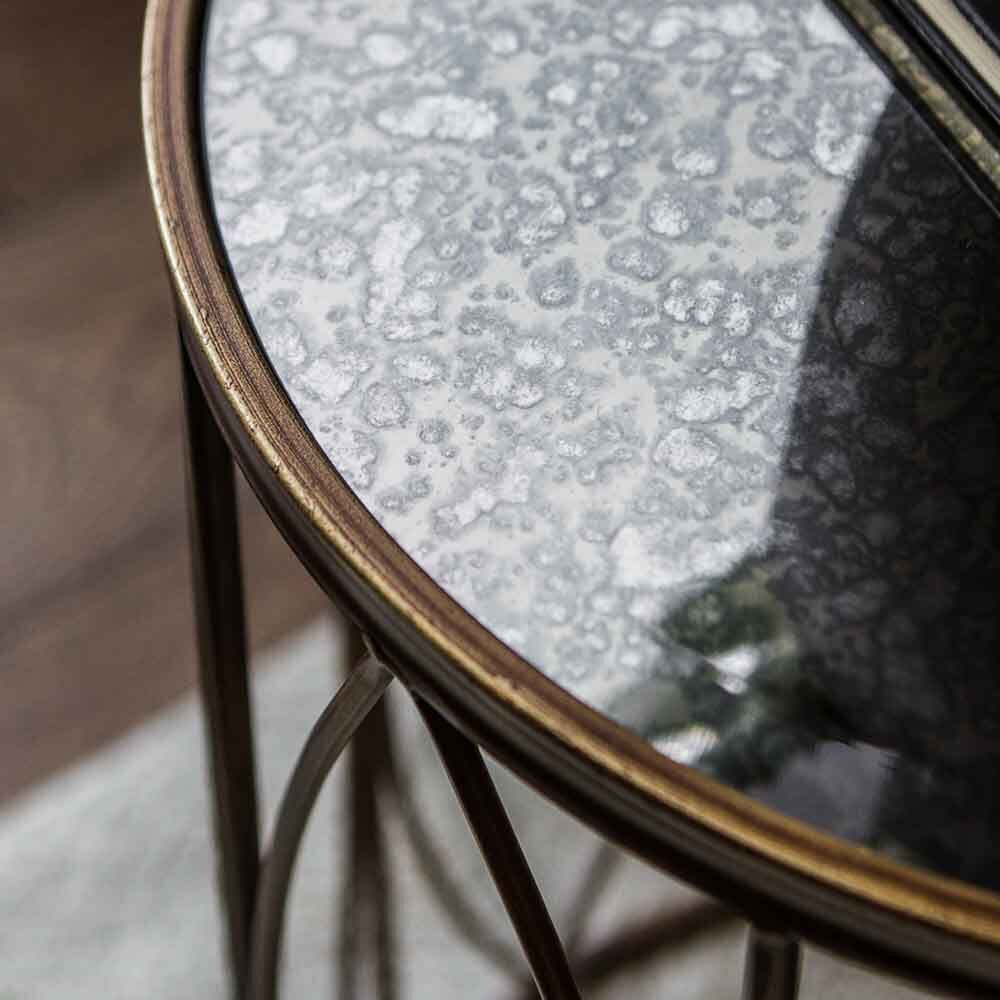 A stylish and practical side table with an antiqued glass top in a bronze effect finish.