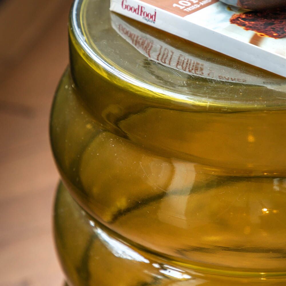 This side table is a unique and stylish addition to any living space. Its organic, bubble-like shape and warm green hue create a playful and inviting look. Perfect for displaying decorative items or using as a side table next to a sofa or armchair.