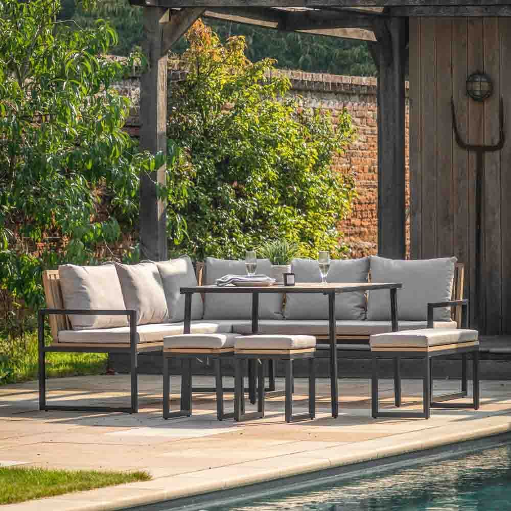 Perfect for BBQ’s this corner dining set is just what you need to relax and enjoy the summer evenings. There’s plenty of seating with 2 single stools, a dining bench and a corner sofa finished with comfortable grey cushions around modern a dining table, all made from FSC Acacia with a simple black powder coated metal frame.