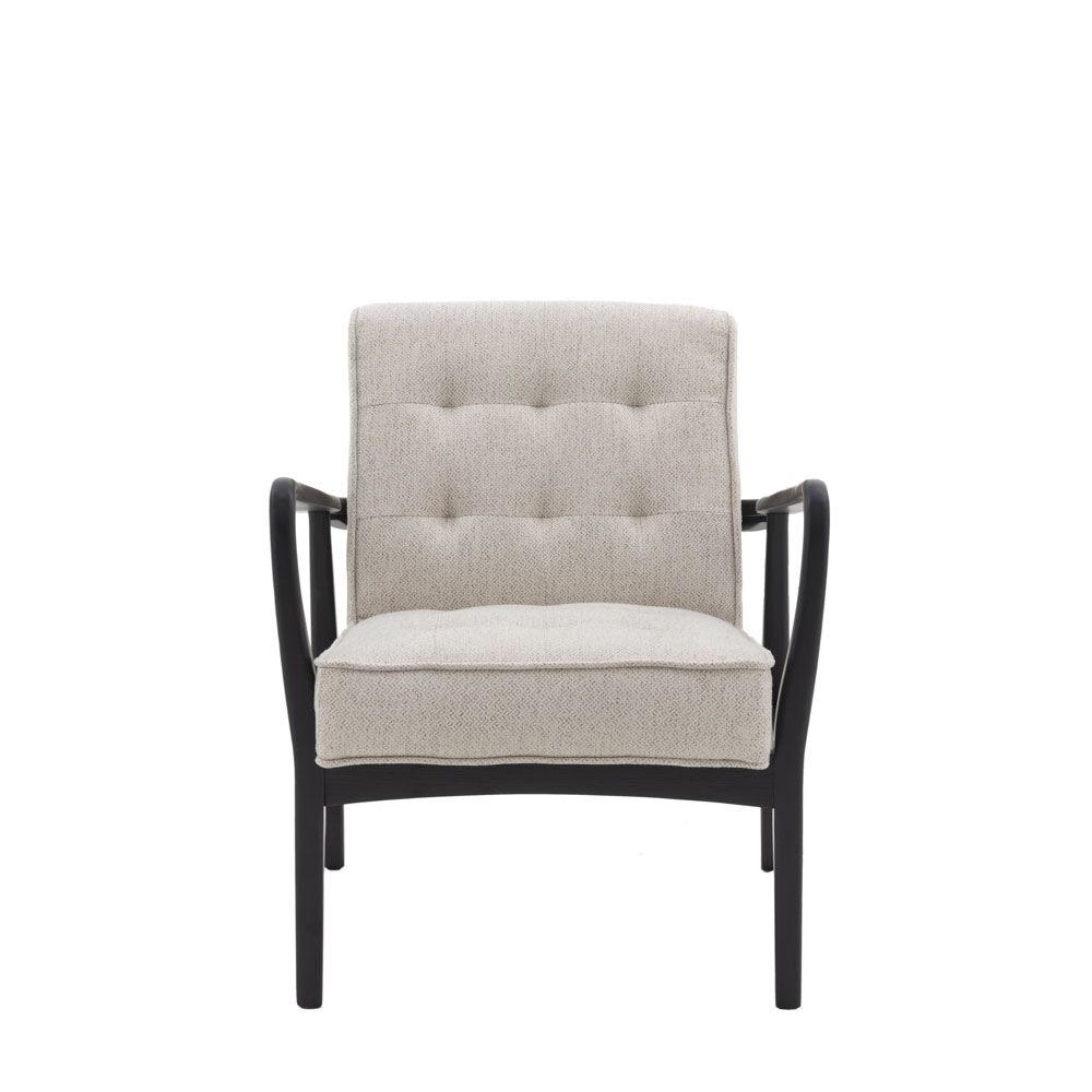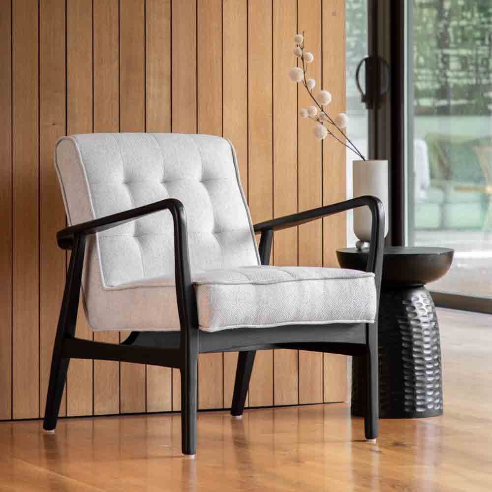 Stand out Mid-Century style with a dramatic black solid oak angled frame and contrasting natural weave upholstery. The deep pull detail and smooth lines create a comfortable feature chair, suited to vintage and modern style homes alike.