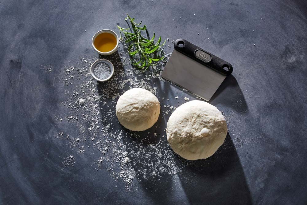 This dough scraper has a practical handle and a sharp blade – perfect for measuring and cutting the raw pizza dough.