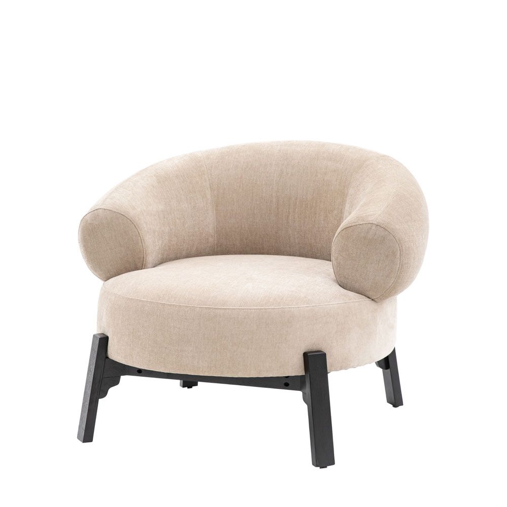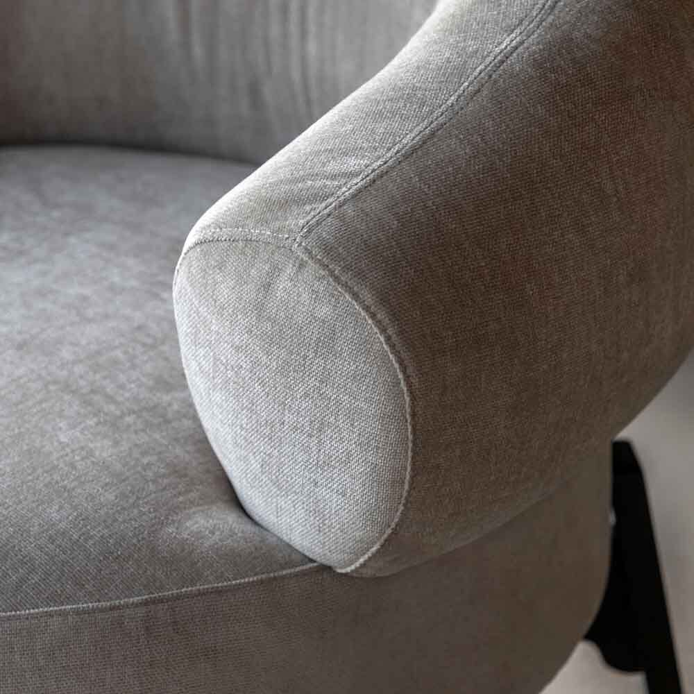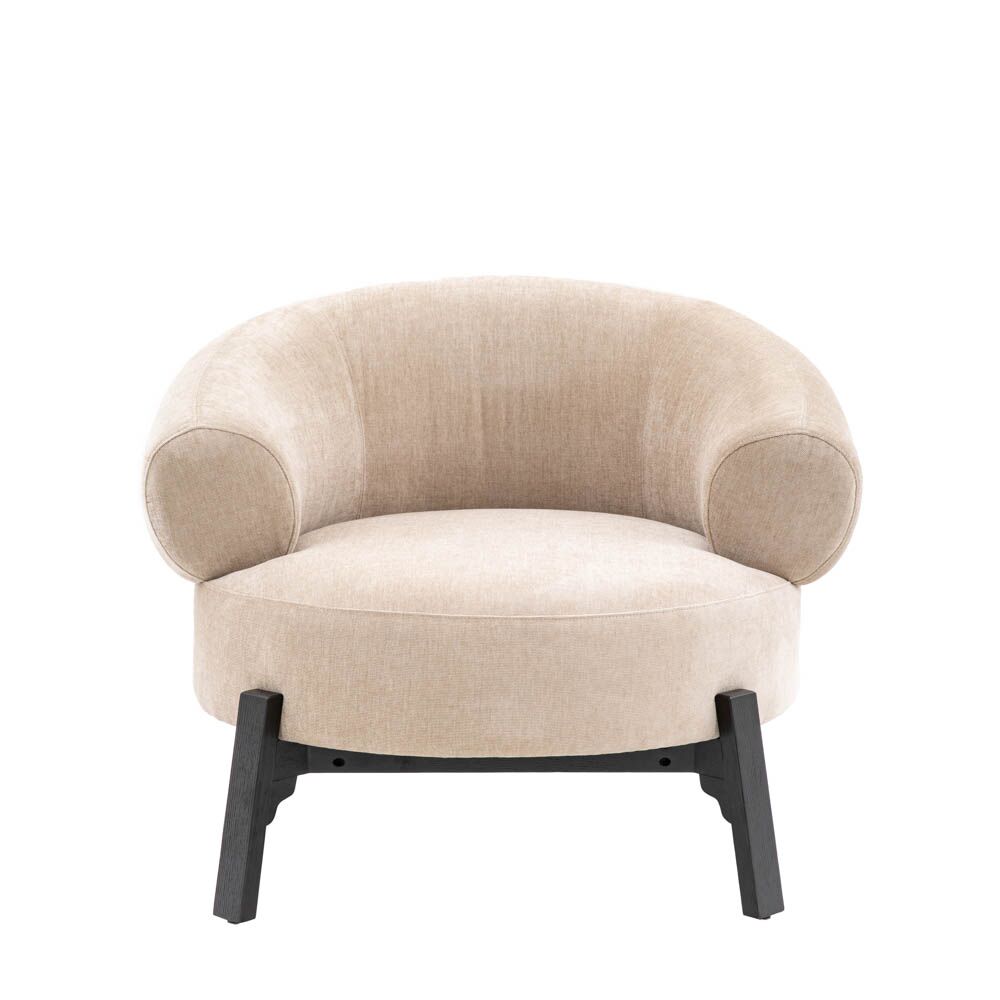 Perfect for getting cosy this well cushioned and extra comfy armchair will become the stand out feature of any space The curved wrap around back and round seat is supported by a bold dark wood base frame and legs, making it an eye catching addition to any room.